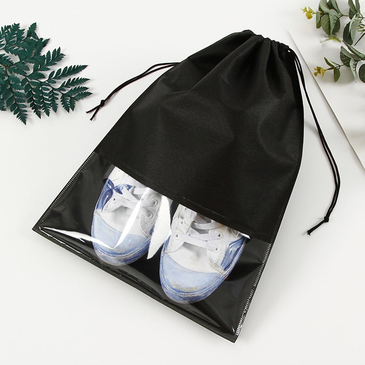 Journey shoe bag is made from non-woven cloth outfitted with drawstring which works nicely in anti-dust, mould proof and anti-abrasion, no odor, light-weight, washable and dry quick.