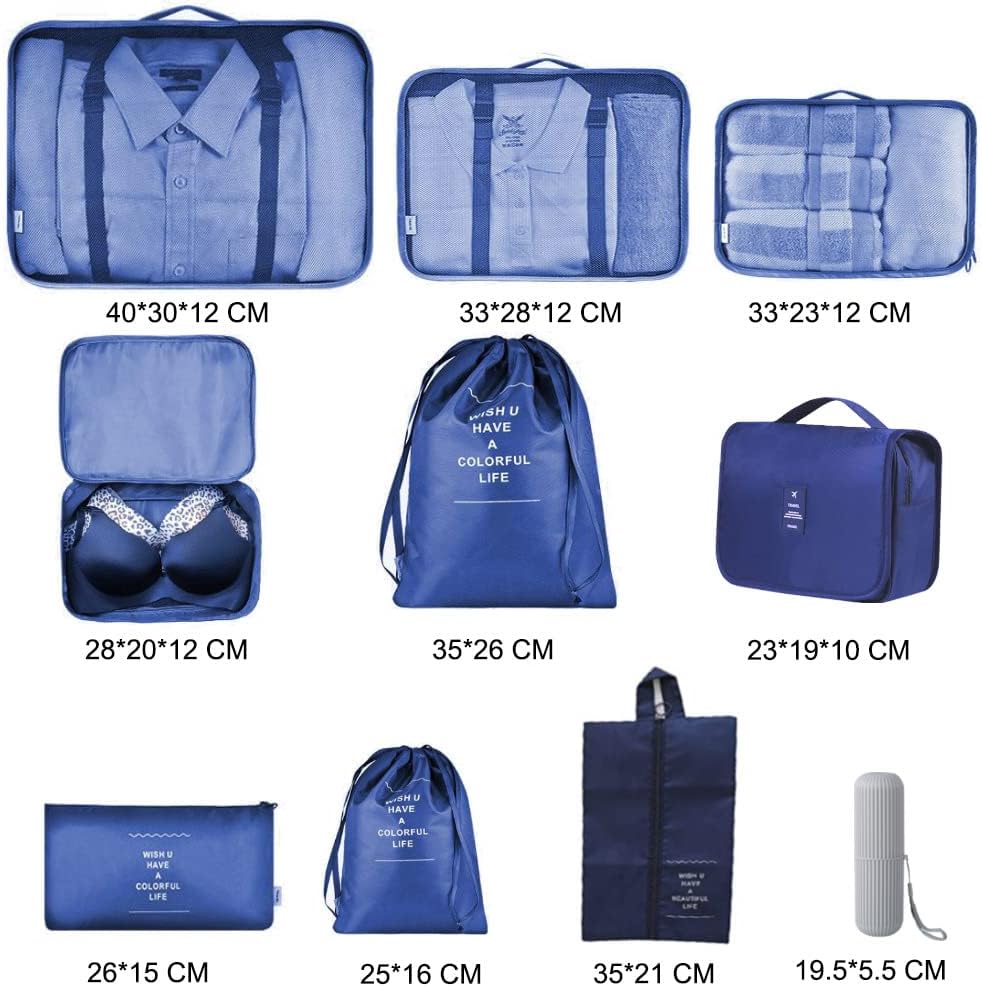 ❤ 10 PCS Journey Packing Set: The Bundle embrace 3 journey packing cubes with see by mesh prime for garments, 1 personal cubes for bras and underwear, 1 journey sneakers bag, 1 toiletry bag, 1 toothbrush cup, 2 drawstring bag for garments or shoe and 1 flat bag for small gadgets, like socks, digital equipment or keys.