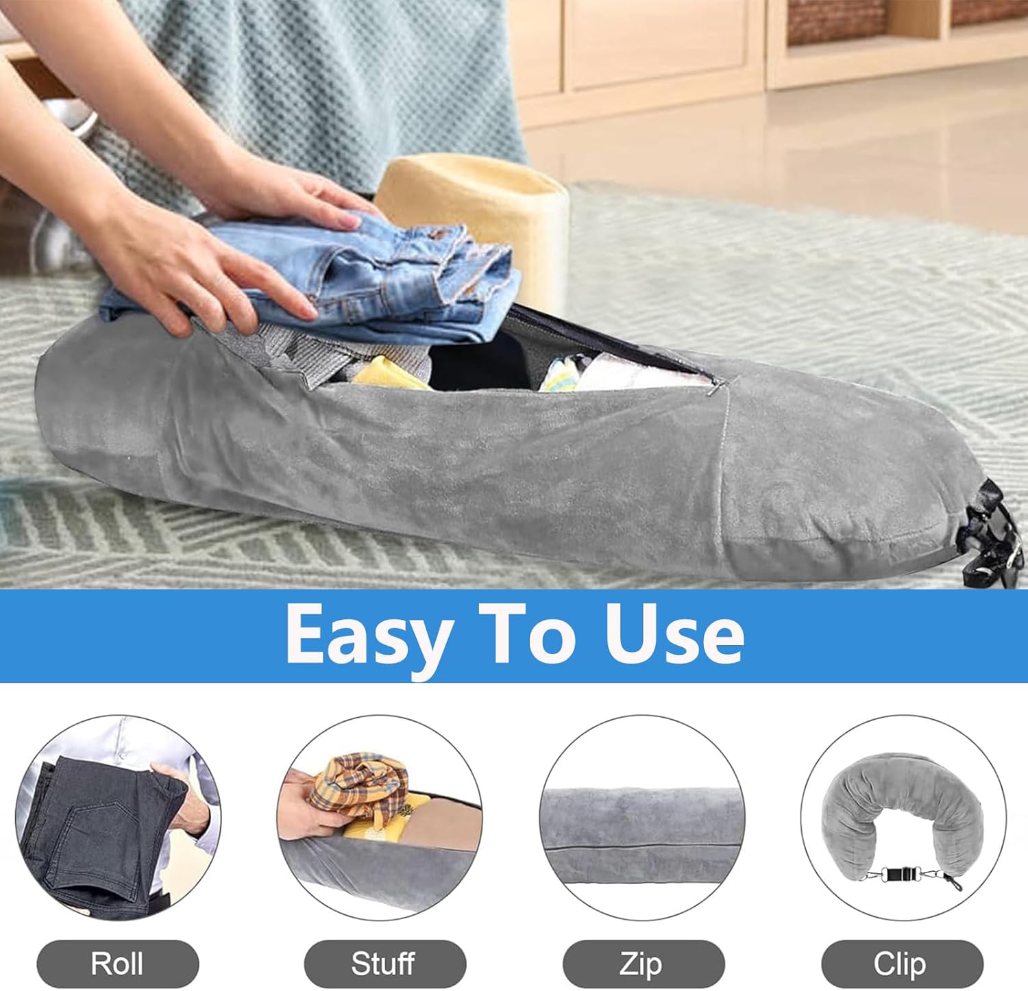 1PCS Stuffable Neck Pillow for Journey, Journey Pillow, Journey neck pillows With Adjustable Straps, Gentle Neck Pillow Fillable Go Journey for Necessities Additional Baggage (Gray) 【Versatile and Sensible】Our stuffable neck pillow for journey affords a novel stuffable design that makes travelling easier. With its self-filling function, it can save you baggage area by stuffing your garments into this pillows. So, neglect about packing additional pillows and making room, you may fill and empty this pillow as you need. 【Designed For Consolation】Our stuffable neck pillow journey necessities for journey ensures a cushty sleep throughout your touring. It may be crammed with garments or different smooth gadgets, making it an ideal, space-saving travelling important. permitting you to make use of your garments for a customized and enjoyable journey expertise. 【Simple Cleansing】Crafted with premium stretch velvet, our journey pillow stuffable with garments is machine cleanable and maintains a classy look, making it an ideal mix of favor and comfort on your journey journey.superior high quality materials, guaranteeing longevity and ease of use. 【Compact and Moveable】This neck pillow for journey is your answer to cumbersome journey pillows that devour quite a lot of baggage area. Simply pack it into your suitcase or backpack and maximize your packing effectivity. 【An Important Journey Companion】 Our stuffable neck pillow for journey is not simply restricted to flights, it’s your must-have accent for all of your journey adventures. From suitcase neck pillow filler to carry-on, it’s your go-to journey companion.