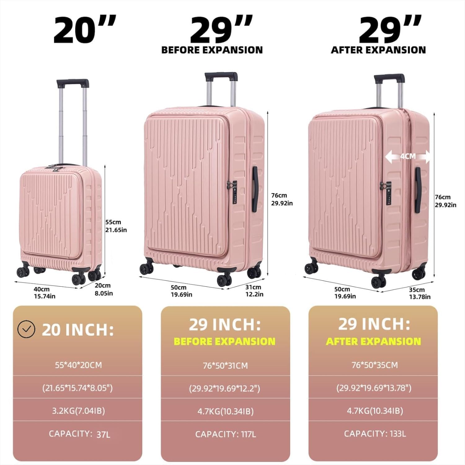 Normal Carry On Overhead Cabin Measurement: Kaleenie 20 Inch Massive cabin suitcase in measurement 40*20*55cm(21.65*15.74*8.05″), 3.2Kg(6.4Ib), 37L capability. This huge cabin suitcases are excellent for enterprise travellers staying just a few days at your vacation spot. The big cabin suitcase with 4 360° Common wheels can be excellent for short-haul flights.