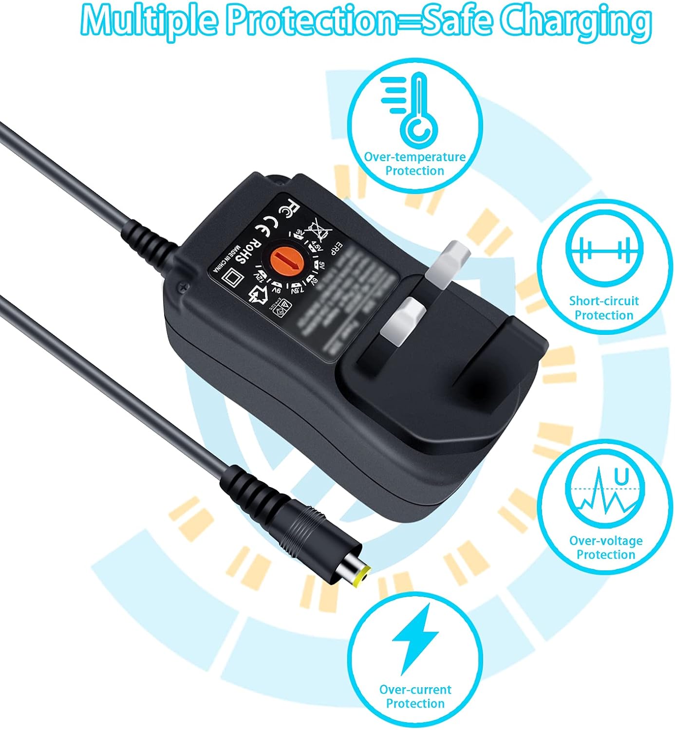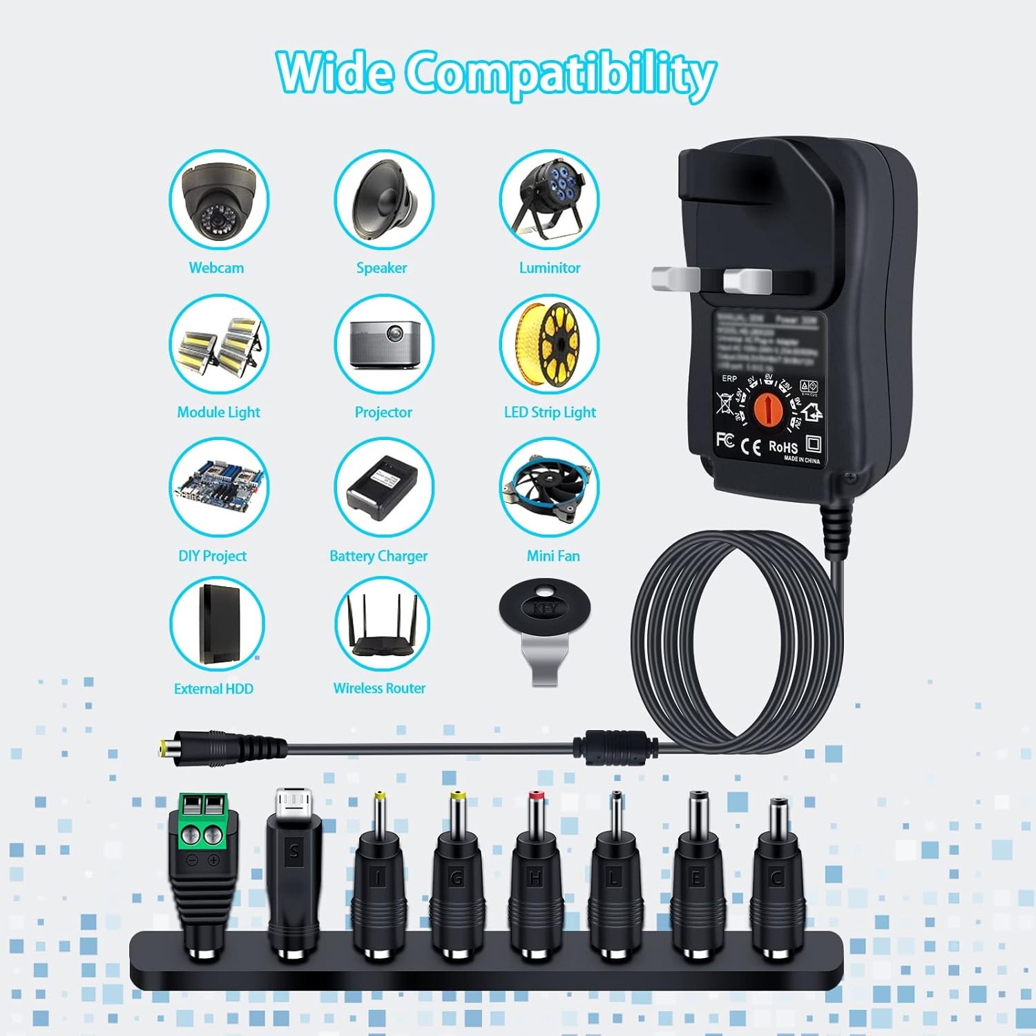 【Multifunctional Adjustable Transformers】It comes with an unique 5.5×2.1mm tip(inside”+”, exterior”-“) , you’ll be able to simply change the 8 suggestions: 2.5×0.7mm,3.0×1.1mm,3.5×1.35mm,4.0×1.7mm,5.0×2.1mm,5.0×2.5mm,Micro USB and DC terminal connector.And variable voltage is simple to pick out, you’ll be able to converts to totally different Voltage utilizing the offered key.