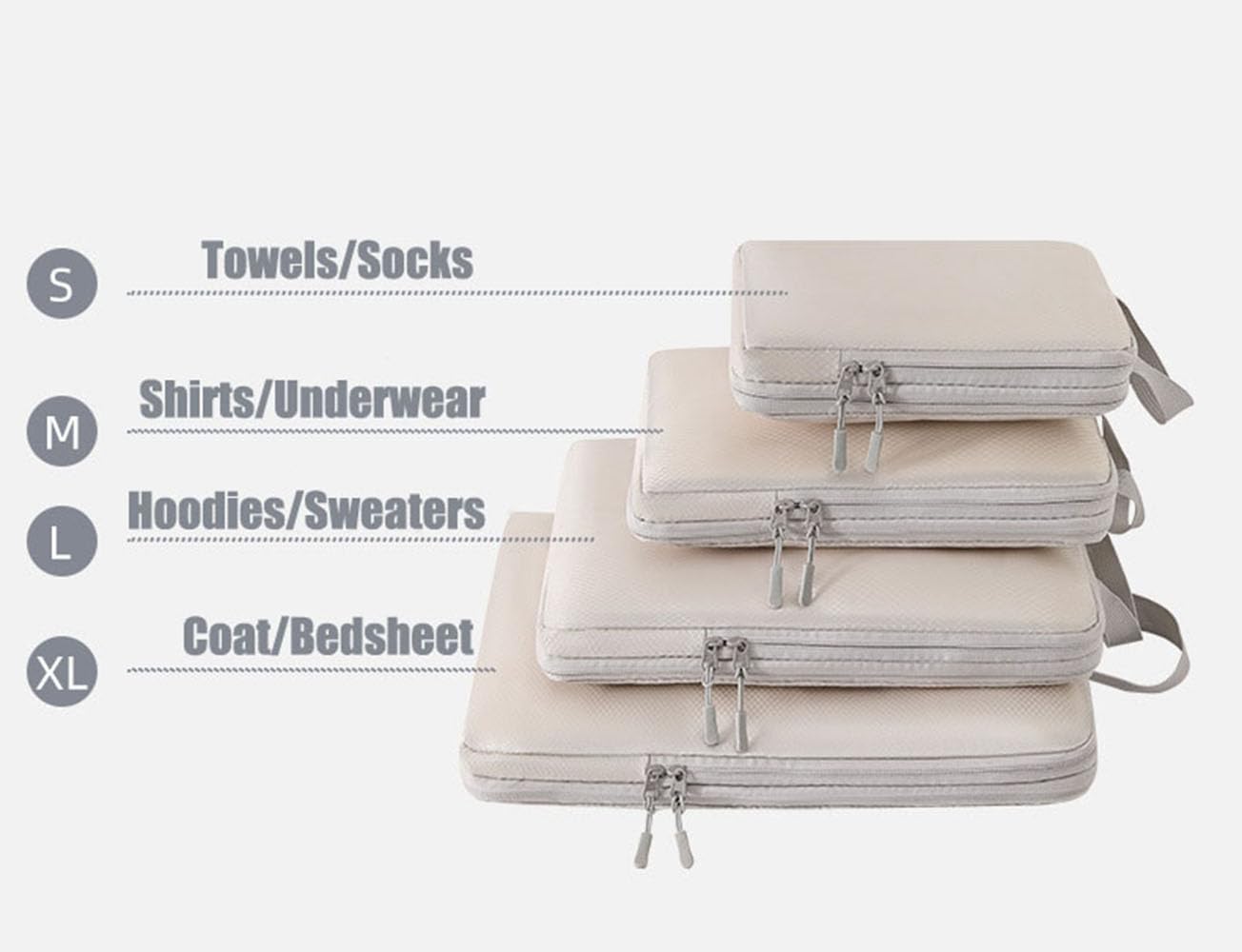 4 Totally different Sizes: The set consists of an S dimension packing dice (20x8x25cm/8x3x10in), an M dimension packing dice (22x10x32cm/9x4x13in), an L dimension packing dice (26x10x35cm/10x4x14in), and an XL dimension packing dice (30x10x41cm/12x4x16in) for various sizes of journey garments you would possibly carry in your journey, equivalent to towels, socks, underwear, shirts, hoodies, jackets, sweaters. coat, pants, even bedsheets