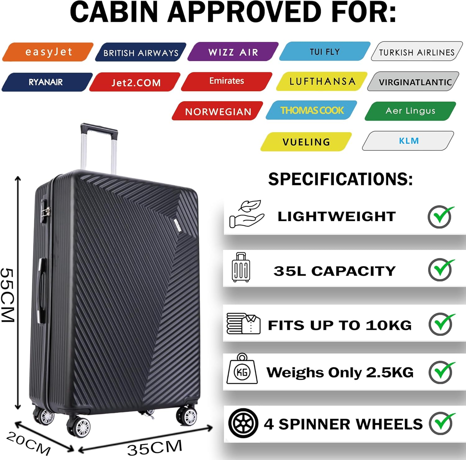 55x35x20 Cabin Luggage 4 Wheel Lightweight Suitcase Hand Carry On Case Flight Travel Bag Hard Shell ABS Approved On Board Fits EasyJet Ryanair Jet 2 KLM Fit Upto 10kg