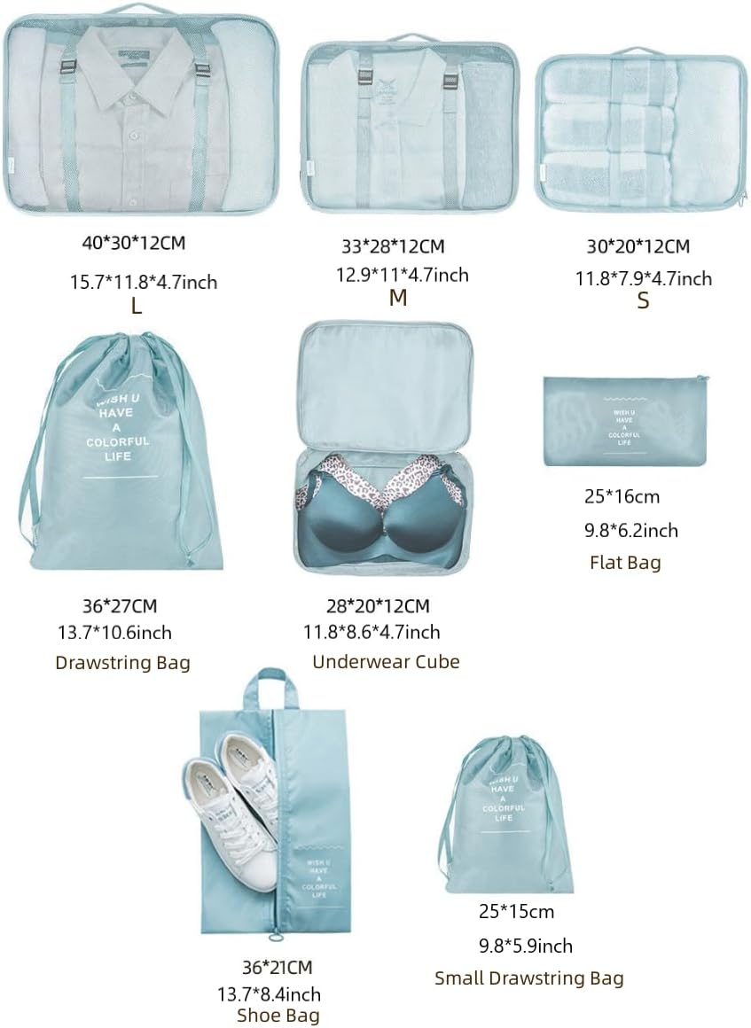 【8 Items Packing Cubes for Journey 】One set contains 3 sizes of garments packing cubes( massive:10-12 shirts,medium:7-9 Shirts, small: 5-6 shirts), 1 bra underwear bag, 1 Sneakers Bag, 1 zippered bag, 1 Drawstring Laundry Bag and 1 Small Drawstring Bag,. Straightforward to pack all of your baggage properly in your 18”-32” suitcase, carry-on bag, drawers, or backpack for short-term or long-term journeys.