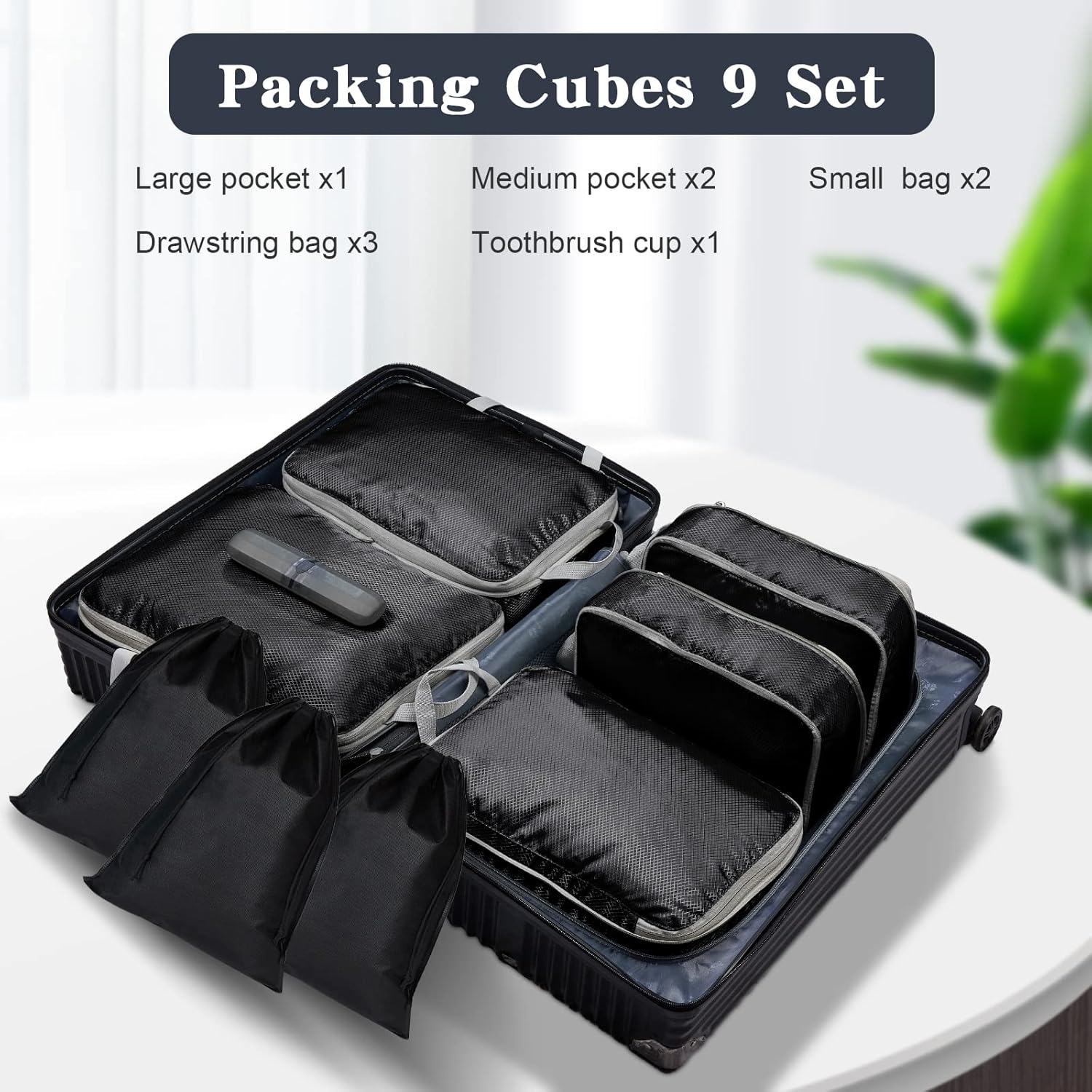 Pystuvo 9 PCS Journey packing cubes: This set consists of 5 journey packing luggage (L*1: 40X10x35cm, M*2: 35x10x25cm, S*2: 30x10x20cm), 3 bundles pockets, 1 toothbrush cup, packing cubes for suitcases may be very Good storage and classification clothes, garments, underwear, sneakers, cosmetics, laundry merchandise and digital equipment. Hold your issues tidy and cut back the wrinkles of garments and injury to different travels.