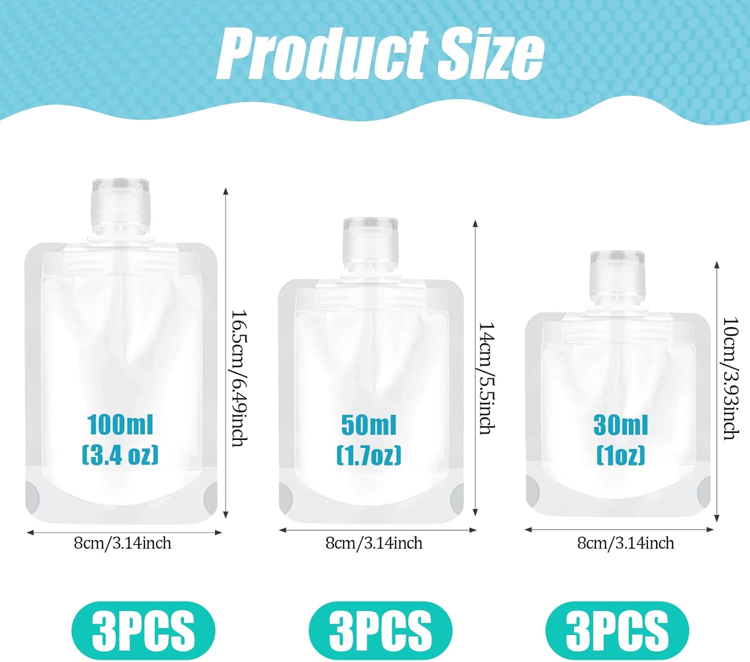 Package deal Consists of: You’ll obtain 9 items of empty journey liquid containers in 30ml, 50ml and 100ml, 3pcs for every capability. With these transportable journey containers, your trip or journey will likely be extra fulfilling and fantastic.