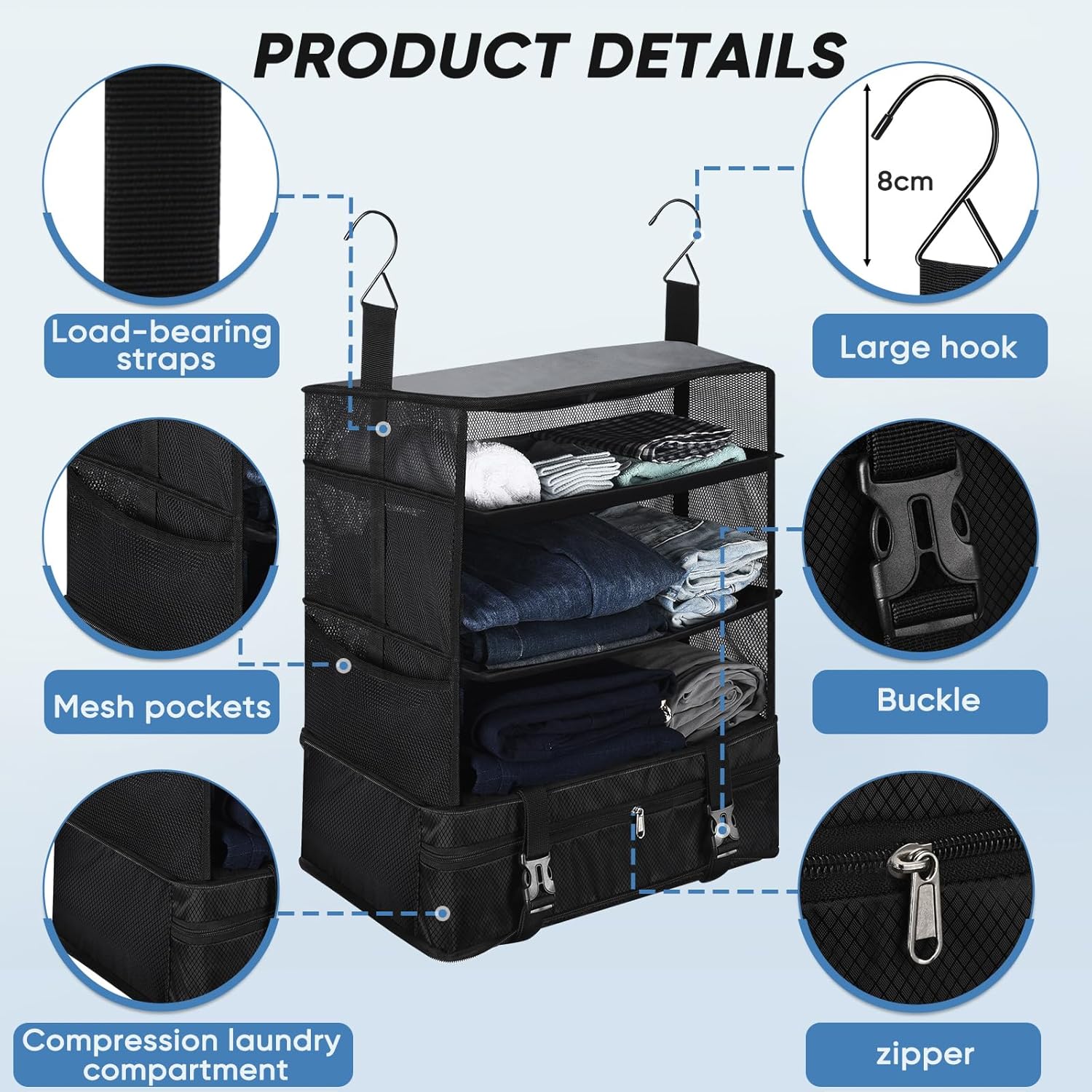 WIDE APPLICATION This transportable hanging journey organizer shelf is simple to fold and unfold and is available in 3 shapes: hanging, in suitcase, and as a compact shelf. Hanging suitcase organiser not solely matches within the suitcase, however will also be successfully used at dwelling, within the dorm, within the lodge or within the hospital to enhance the organisation of your wardrobe.