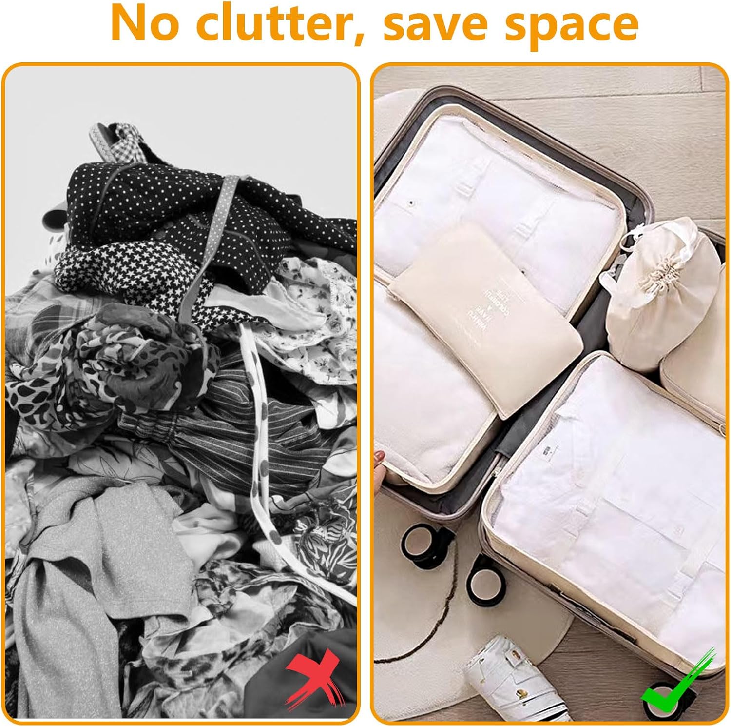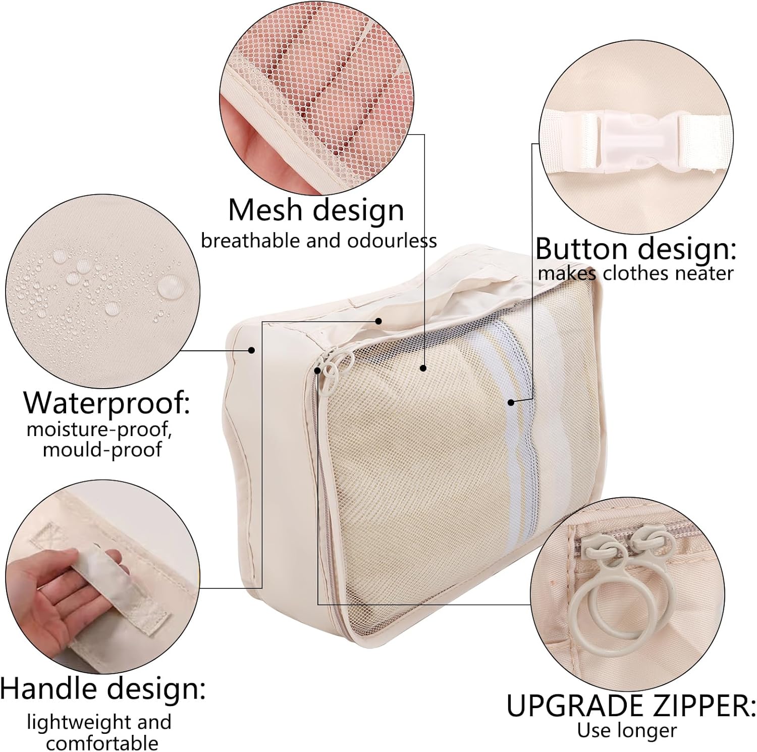 7 Piece Excessive Capability Pouch Set: This set consists of 3 journey pouches with a see-through mesh prime, 1 private pouch for bras and underwear, 1 journey shoe pouch, 1 waterproof drawstring pouch and 1 flat pouch for small gadgets