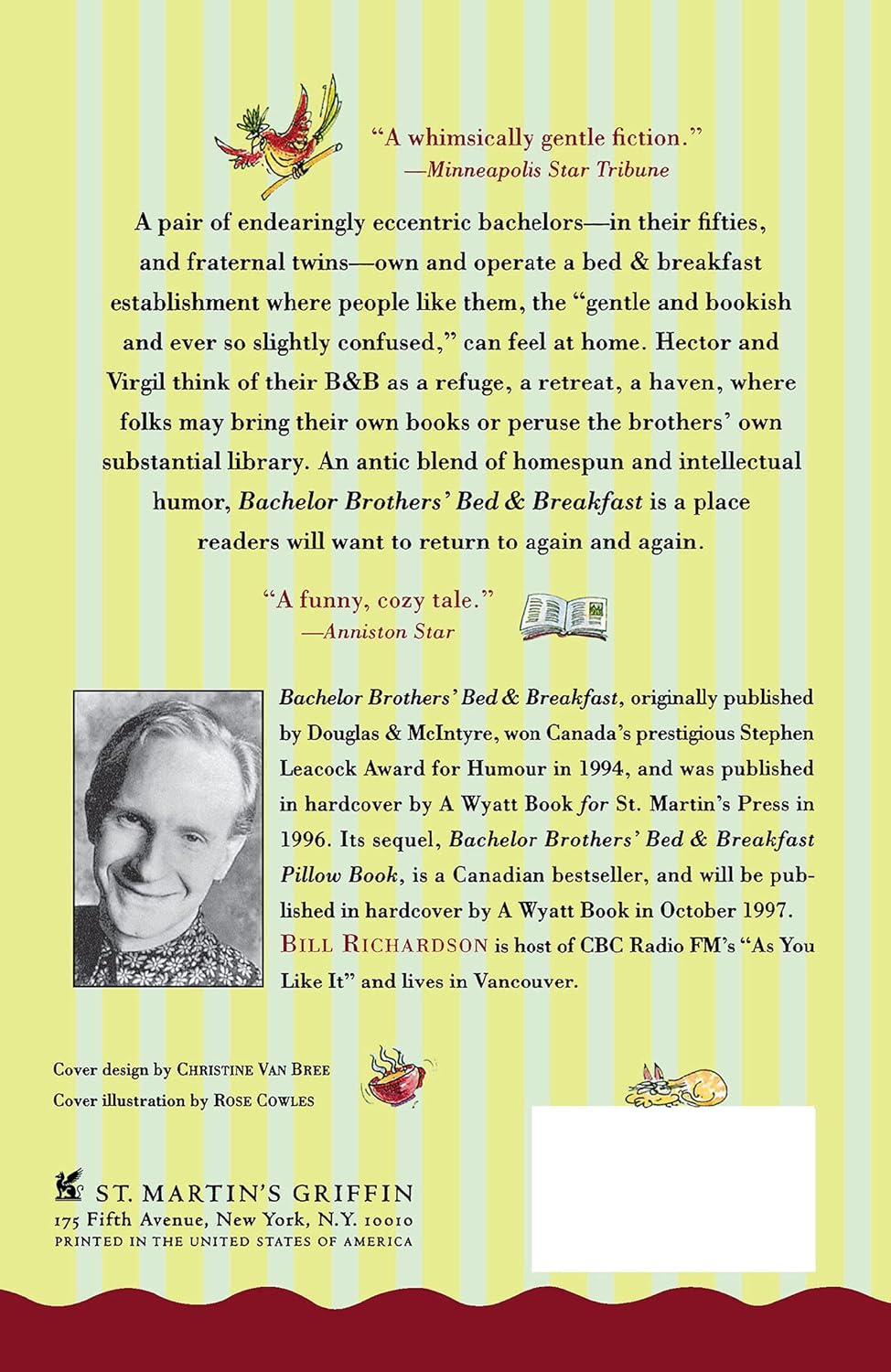 Bachelor Brothers’ Mattress & Breakfast, initially printed by Douglas & McIntyre, gained Canada’s prestigious Stephen Lecock Award for Humour in 1994, and was printed in hardcover by A Wyatt E-book for St. Martin’s Press in 1996. Its sequel, Bachelor Brothers’ Mattress & Breakfast Pillow E-book, is a Canadian bestseller, and shall be printed in hardcover by A Wyatt E-book in October 1997.