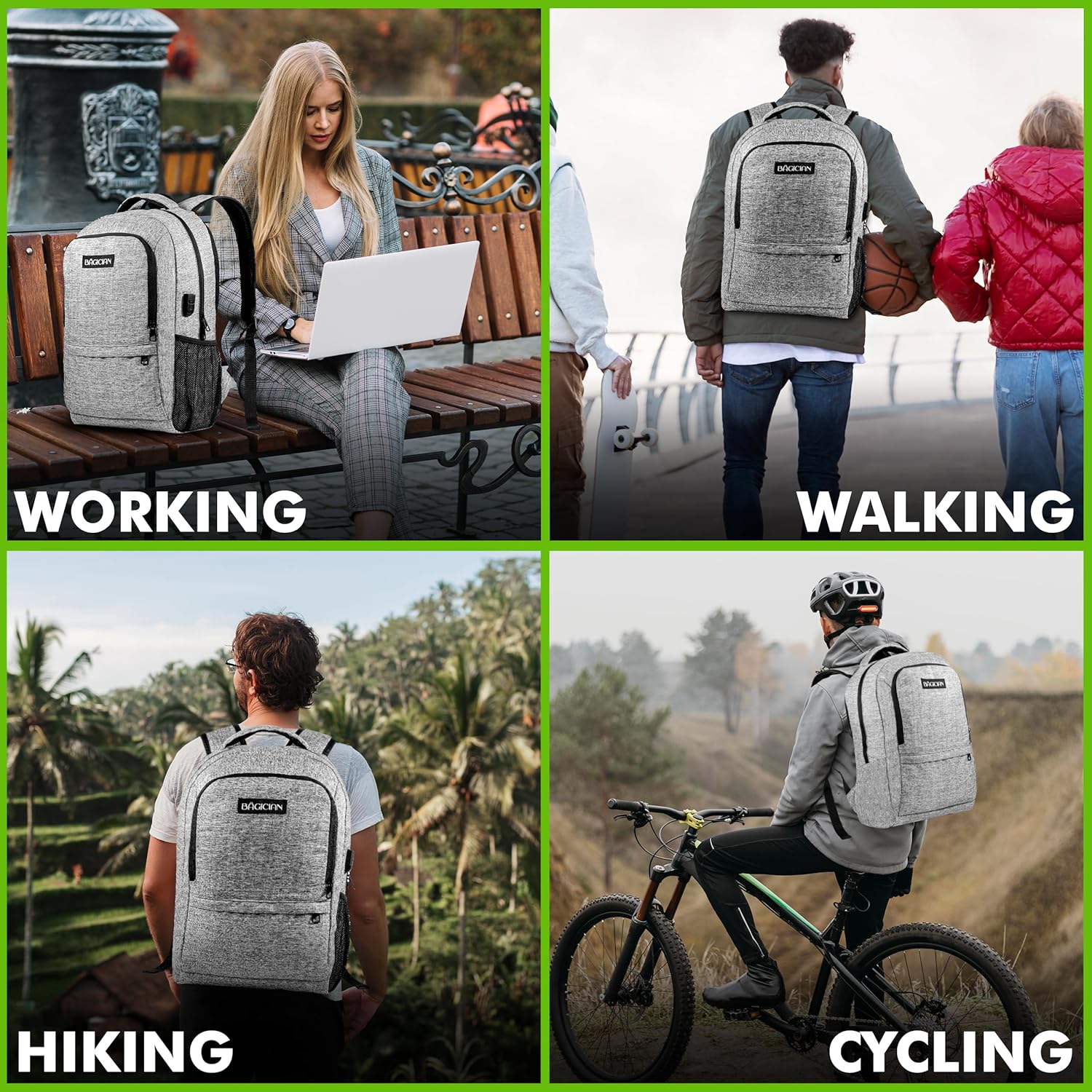 Gray backpack with black straps worn by person on blurred outdoor background. Text identifies it as 'Bagician Extra Large Travelling Bag'.Gray backpack with black straps worn by person on blurred outdoor background. Text identifies it as 'Bagician Extra Large Travelling Bag'.