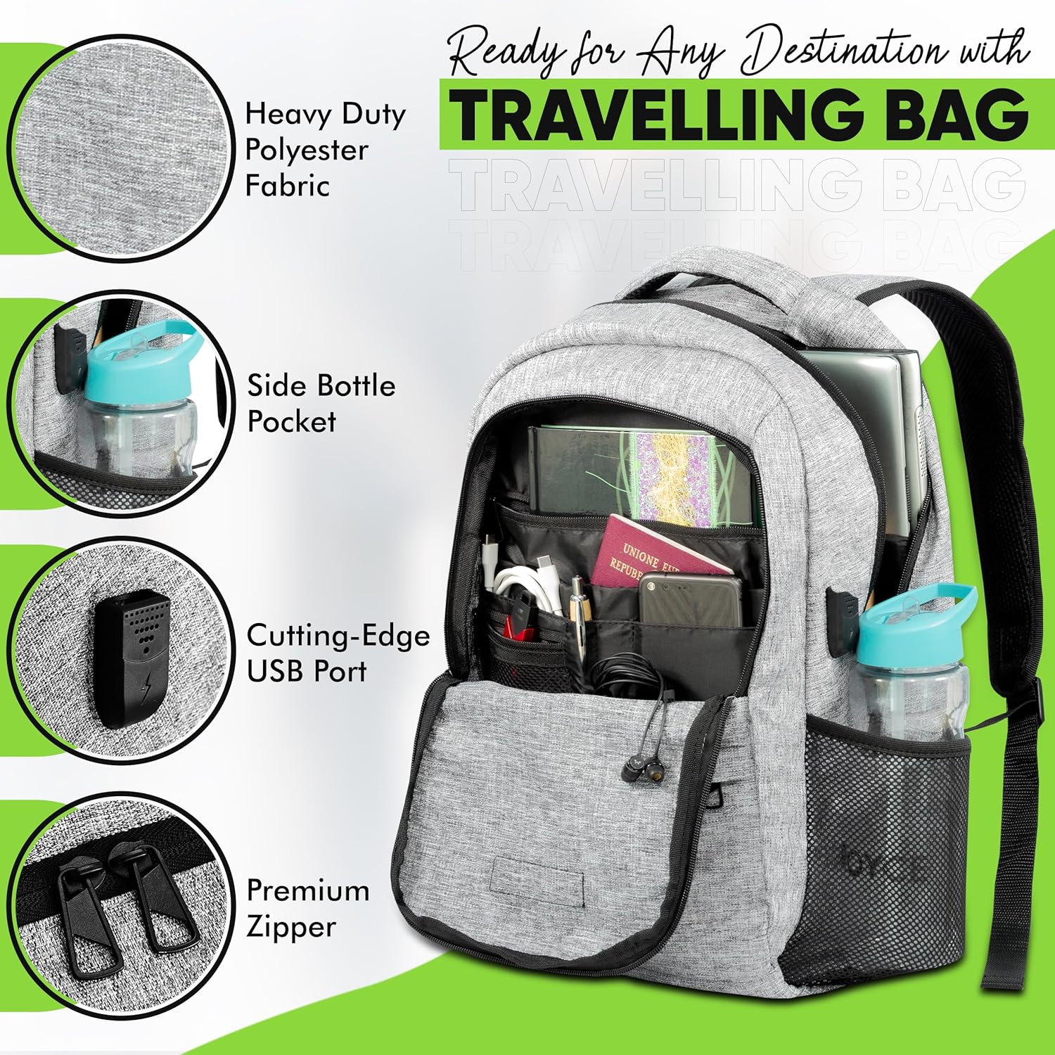 Gray backpack with USB charging port, featuring extra-large capacity. Icons show laptop compatibility, USB charging, and bottle storage. Backpack displayed with connected smartphone.