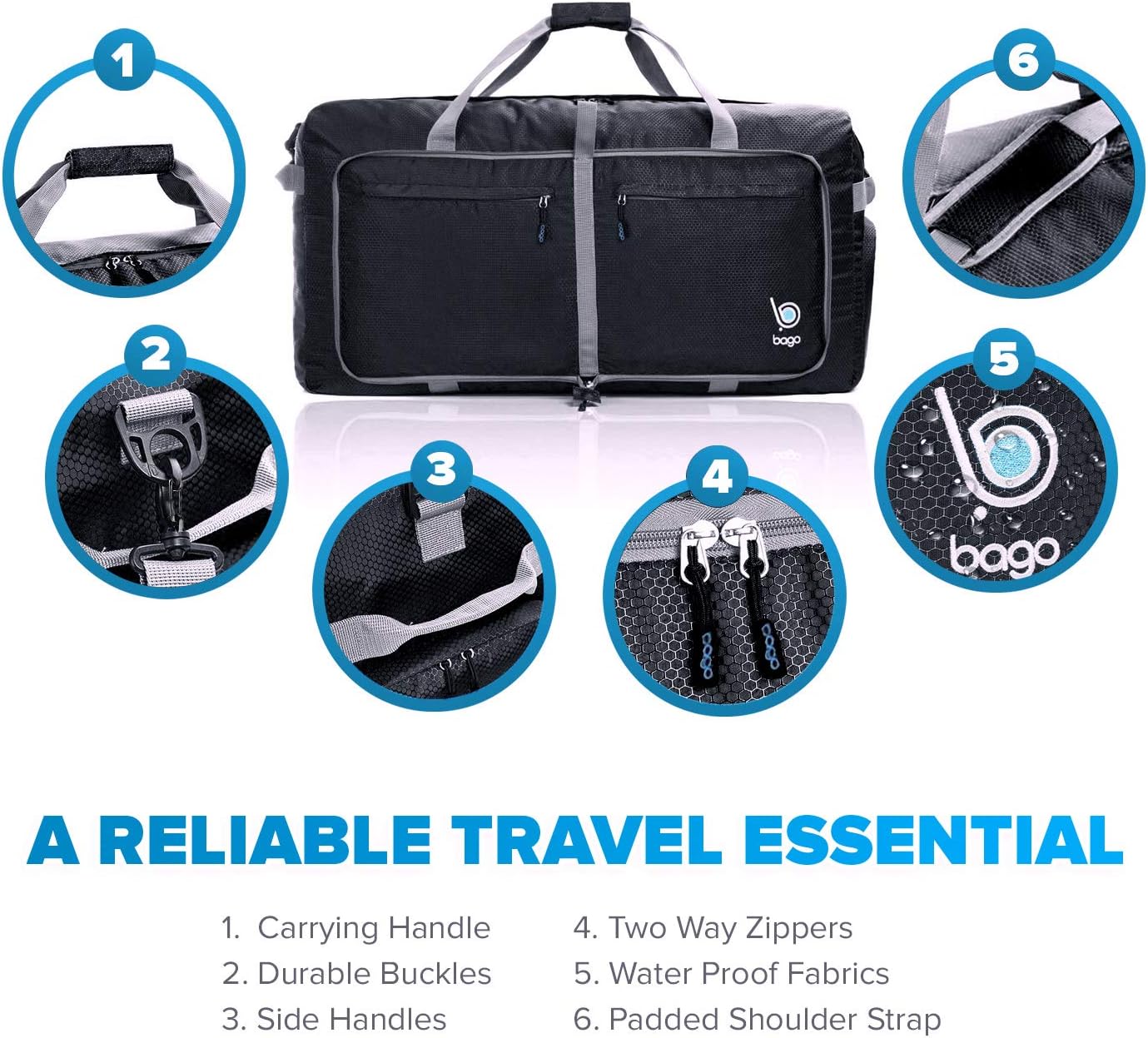 bago Holdall Bags for Men & Women – 100L Spaciously Large Holdall Bag with Shoe Compartment – Travel The World in Style & Convenience – Durable, Lightweight & Foldable Duffle Bag (Black)