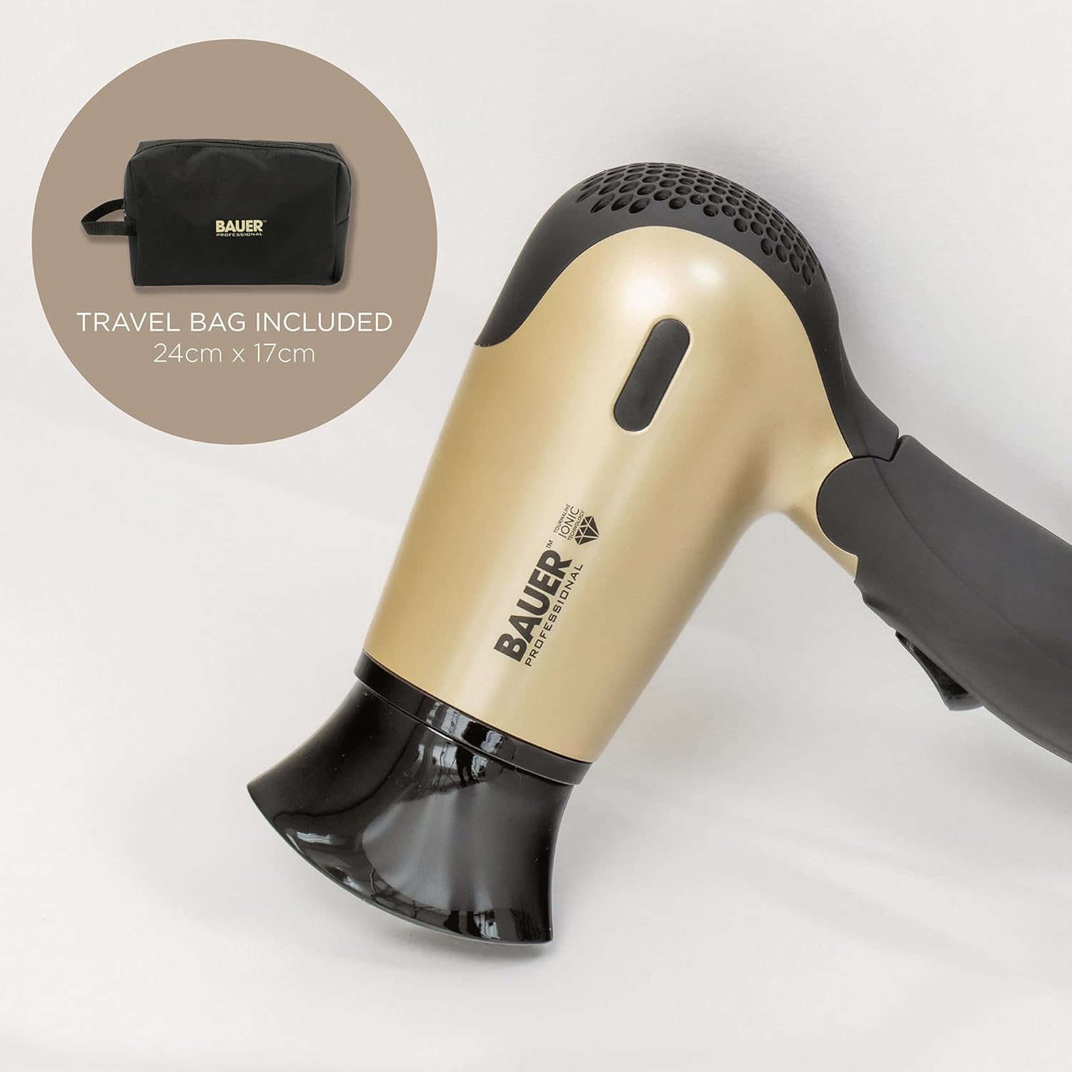 Bauer Professional 38850 Travel Hair Dryer Set/Compact 1200W Travel Hair Dryer with Folding Handle/Carry Case, Hairbrush & Comb / 2 Heat & Speed Settings/Lightweight, Portable, Dual Voltage