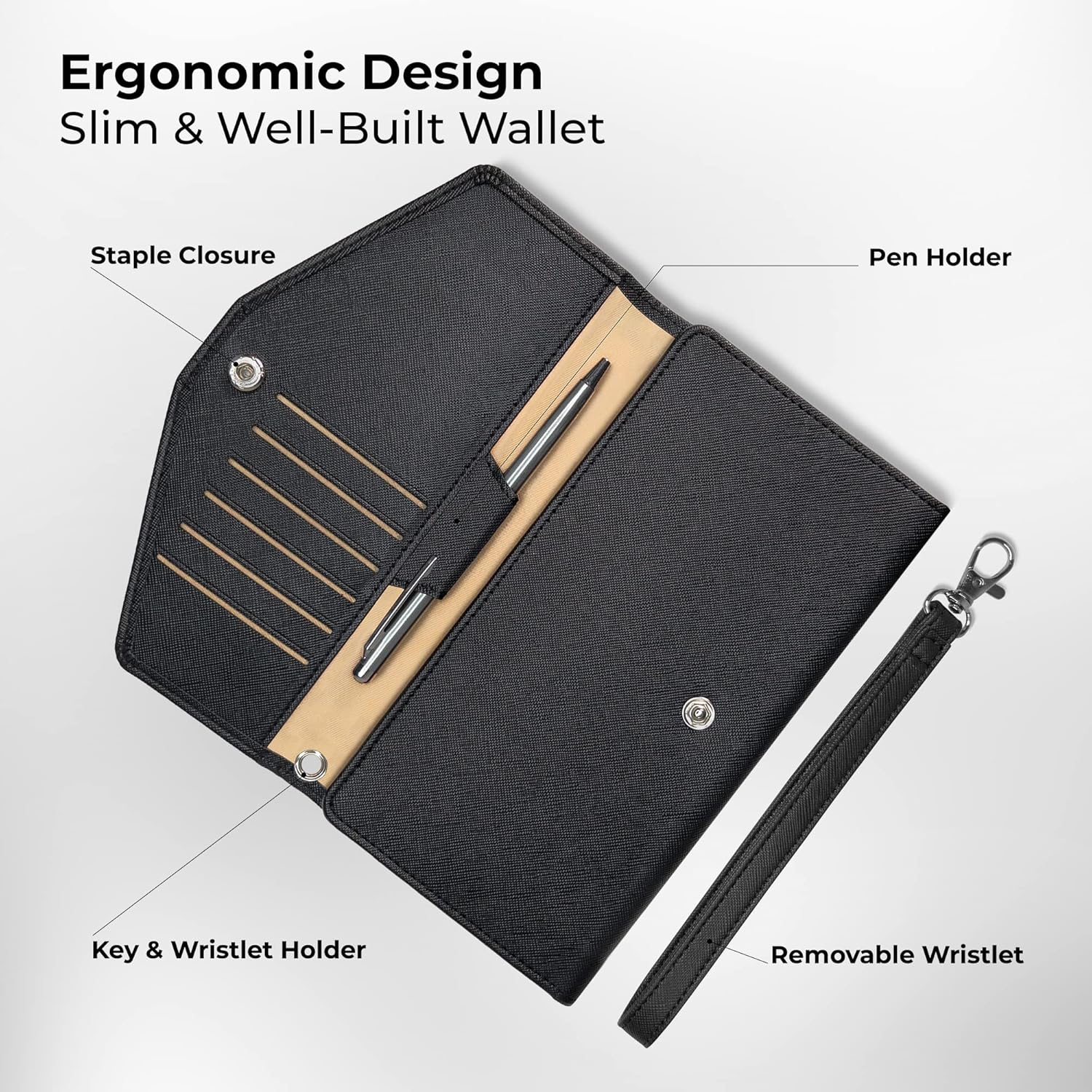 Designed with 13 bank card slots, many pockets for passports, boarding passes, SIM, ID, cash, cash, pen & key holders, and a hand wristlet, this pockets will make your journey protected & untroubled.
