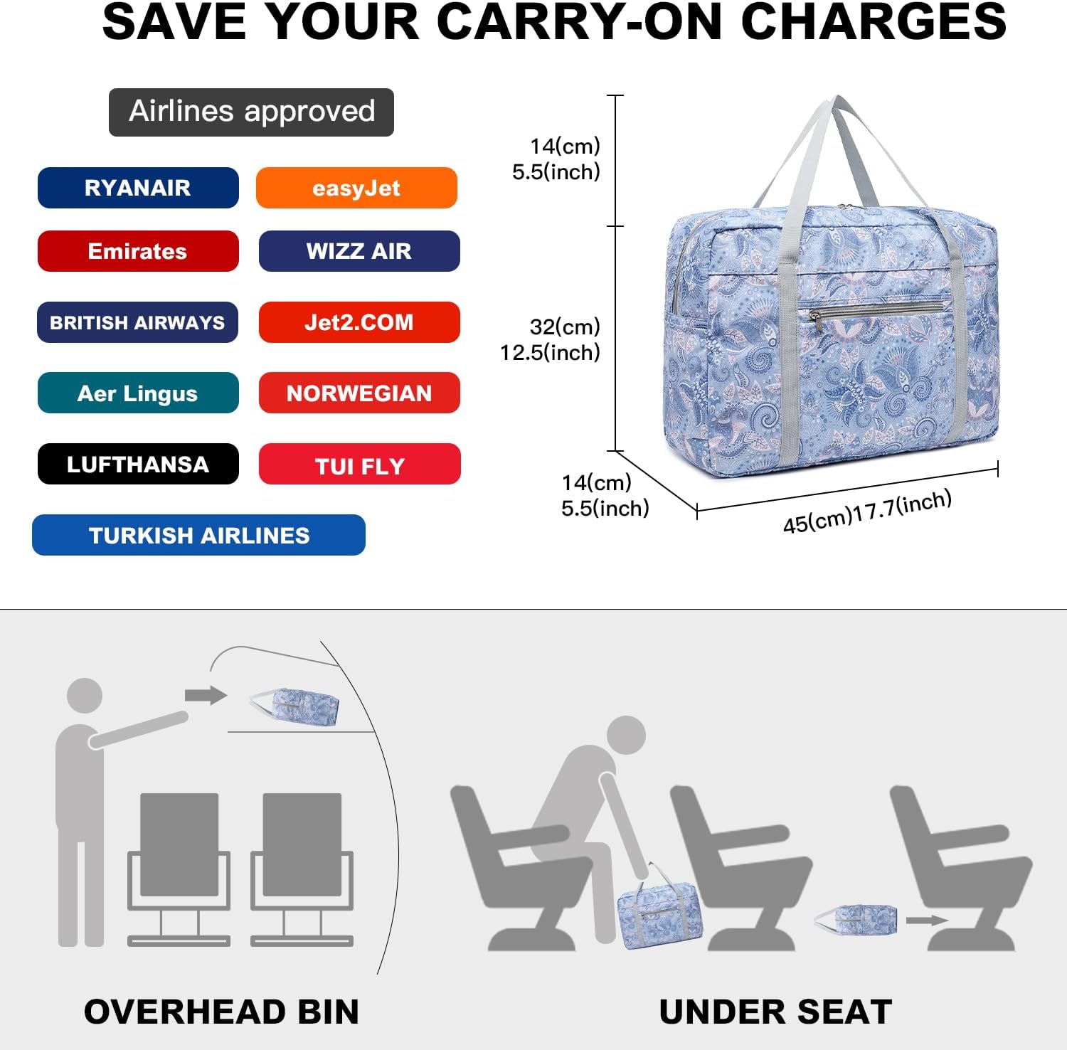 Bag dimension 45*32*14cm/17.7″*12.6″*5.5″ suits small underseat cabin bag dimension 45 x 36 x 20 cm of Easyjet Airways, British Airways, Emirates, Virgin Atlantic and many others. completely, which could be positioned beneath seat and no have to pay for additional baggage.