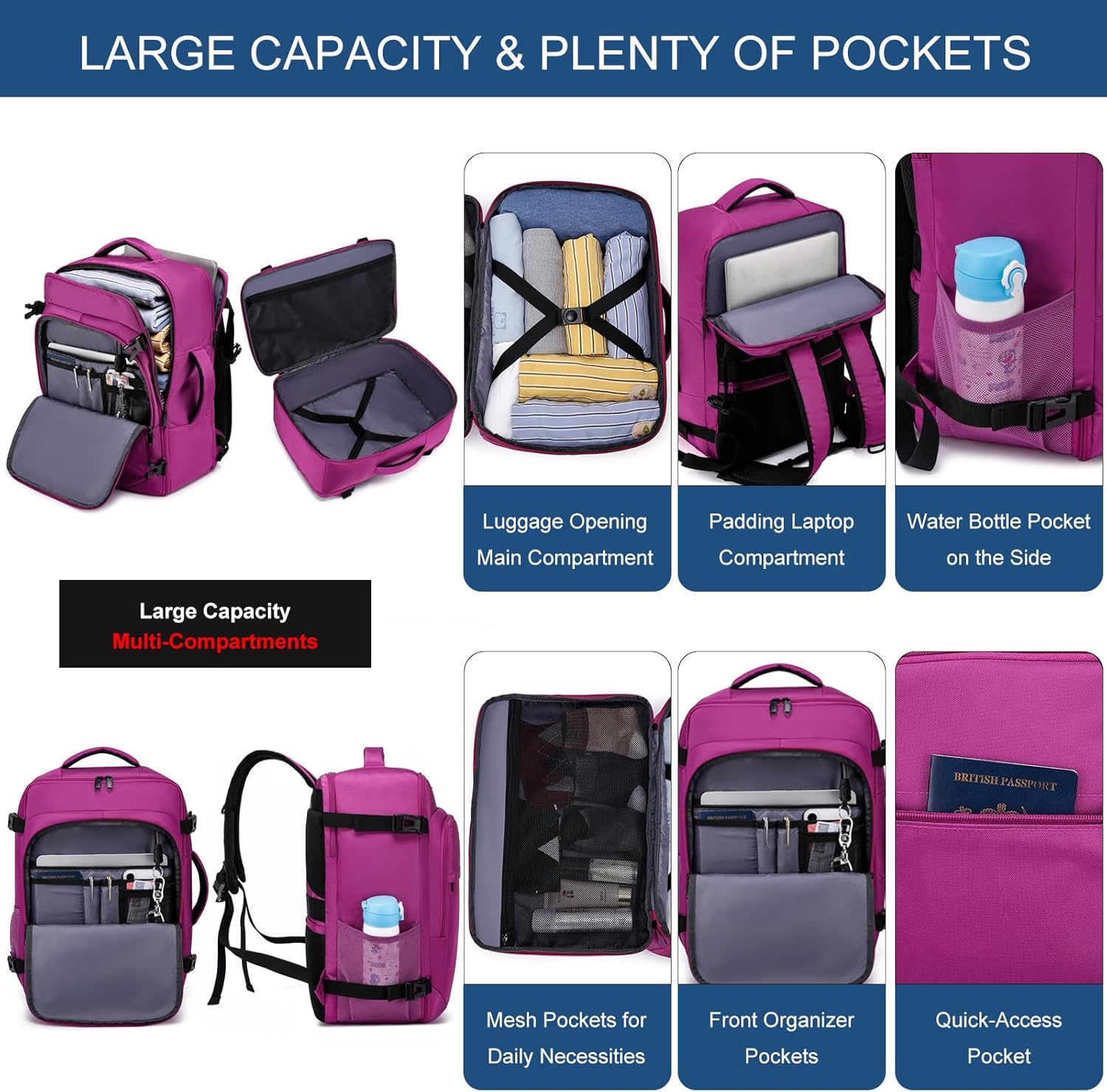 Cabin Bag 45x36x20 for New Easyjet Travel Bag Hand Luggage Backpack Underseat 30L Carry-ons Bag Flight Bag Cabin Size for Airplanes Hand Luggage Rucksack Fit 15.6 Inch Laptop,Purple