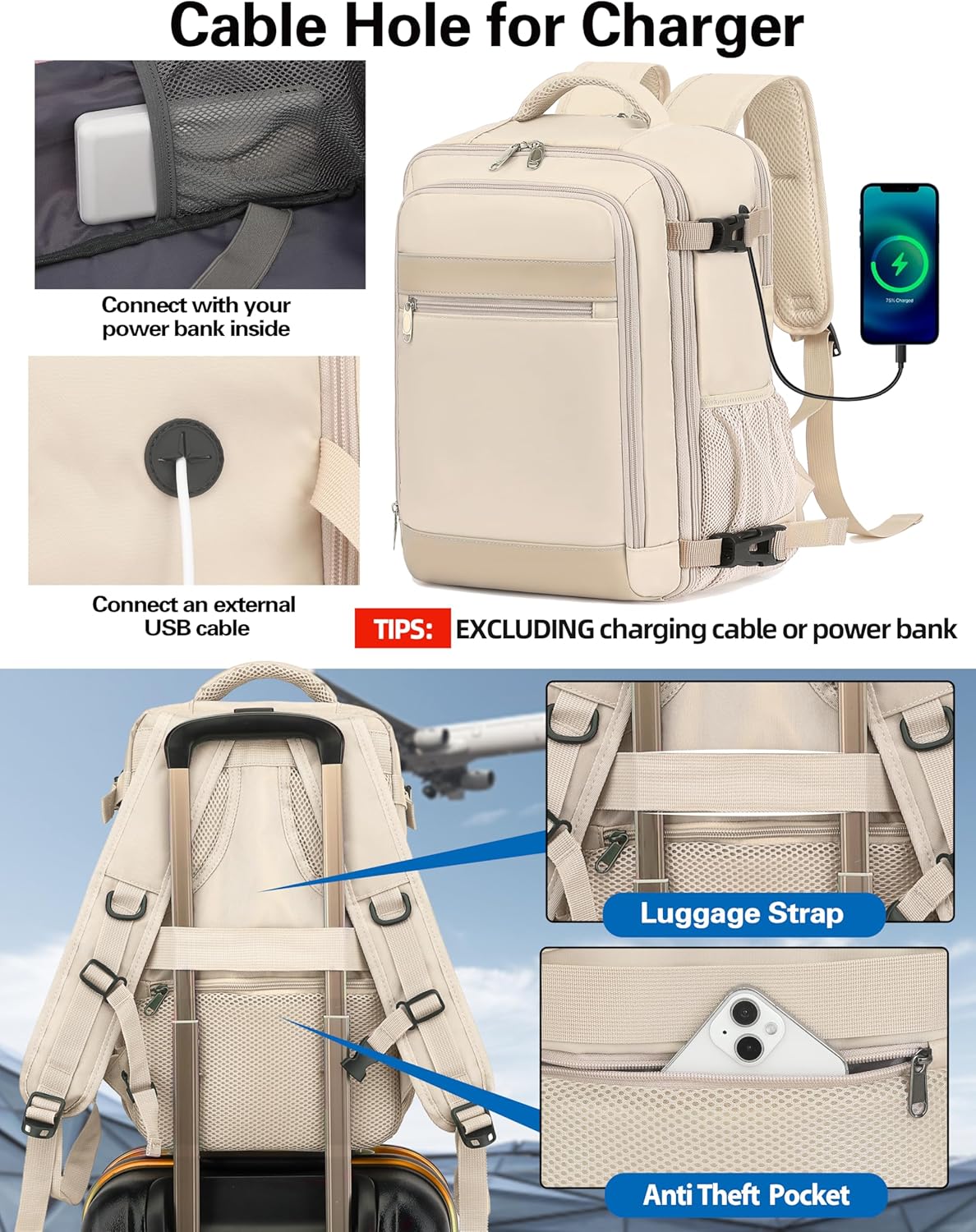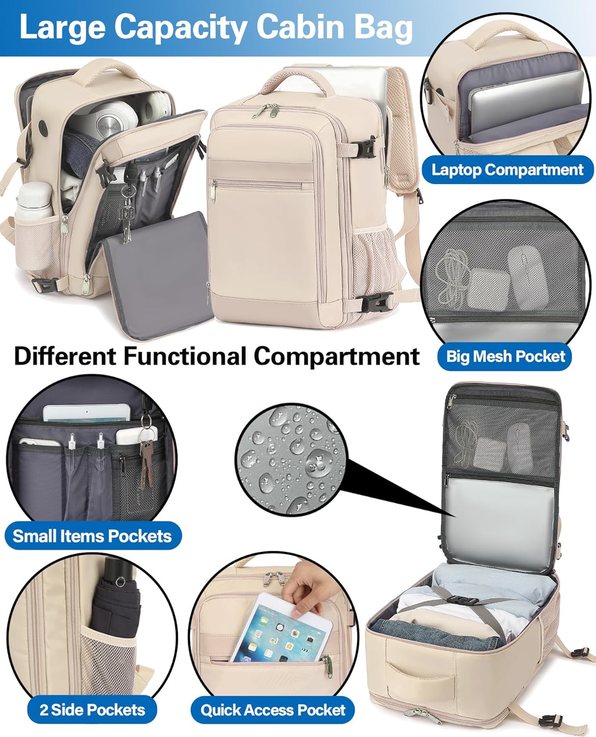 Cabin Bags 40x20x25 for Ryanair Underseat Travel Backpack Ruscksack Carry-ons Hand Luggage Bag Cabin Size 20L for Flight with Laptop Compartment Fit 14 Inch Laptop Beige