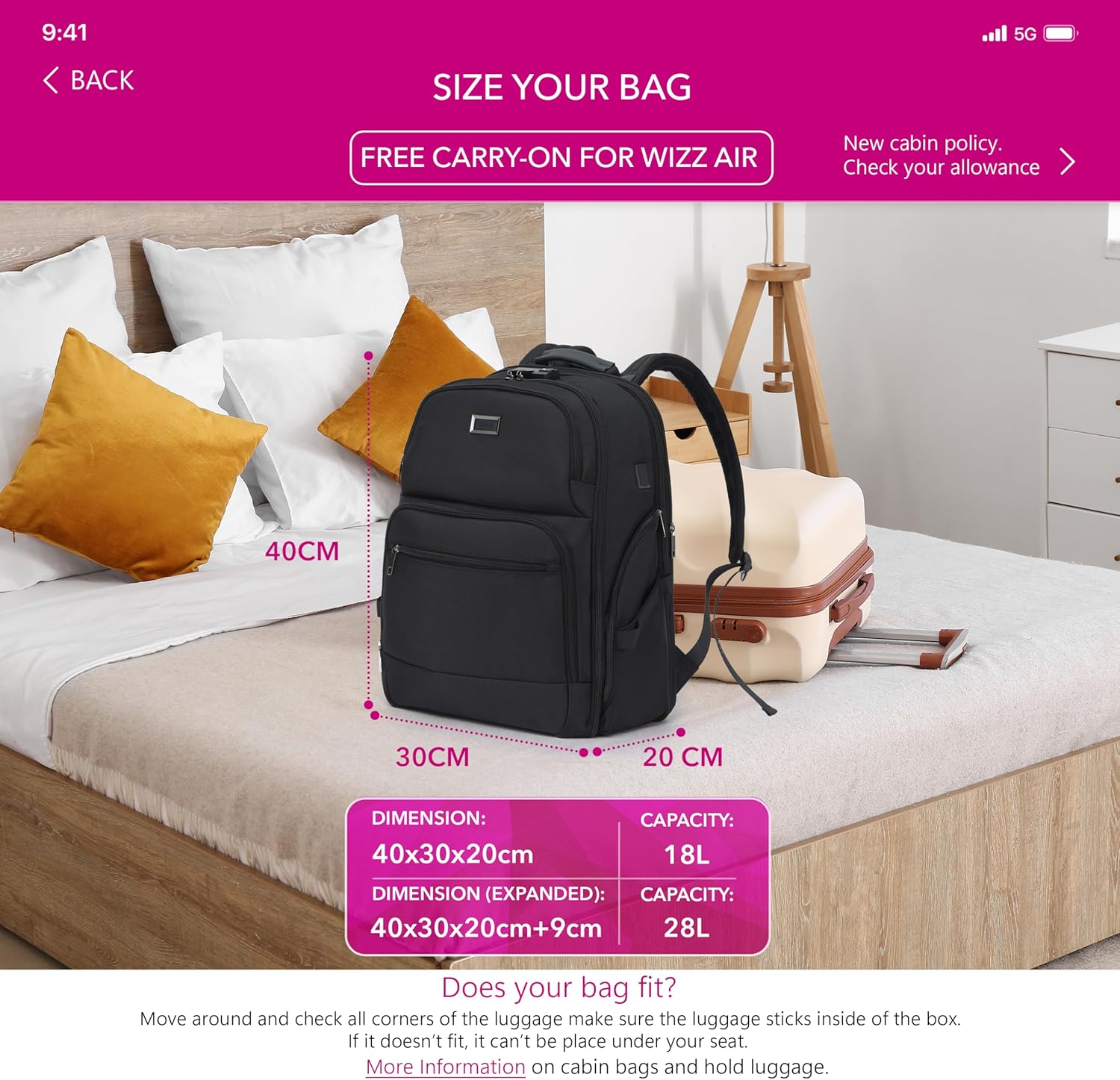 Excellent Match for Wizz Air & Extra: This 24L carry-on journey bag is designed to satisfy Wizz Air cabin luggage 40x30x20cm dimension necessities, making it the perfect underseat cabin bag for Wizz Air and different main airways like EasyJet, Jet2, British Airways and plenty of extra. Compact and Gentle hand baggage answer is right for stress-free journeys.