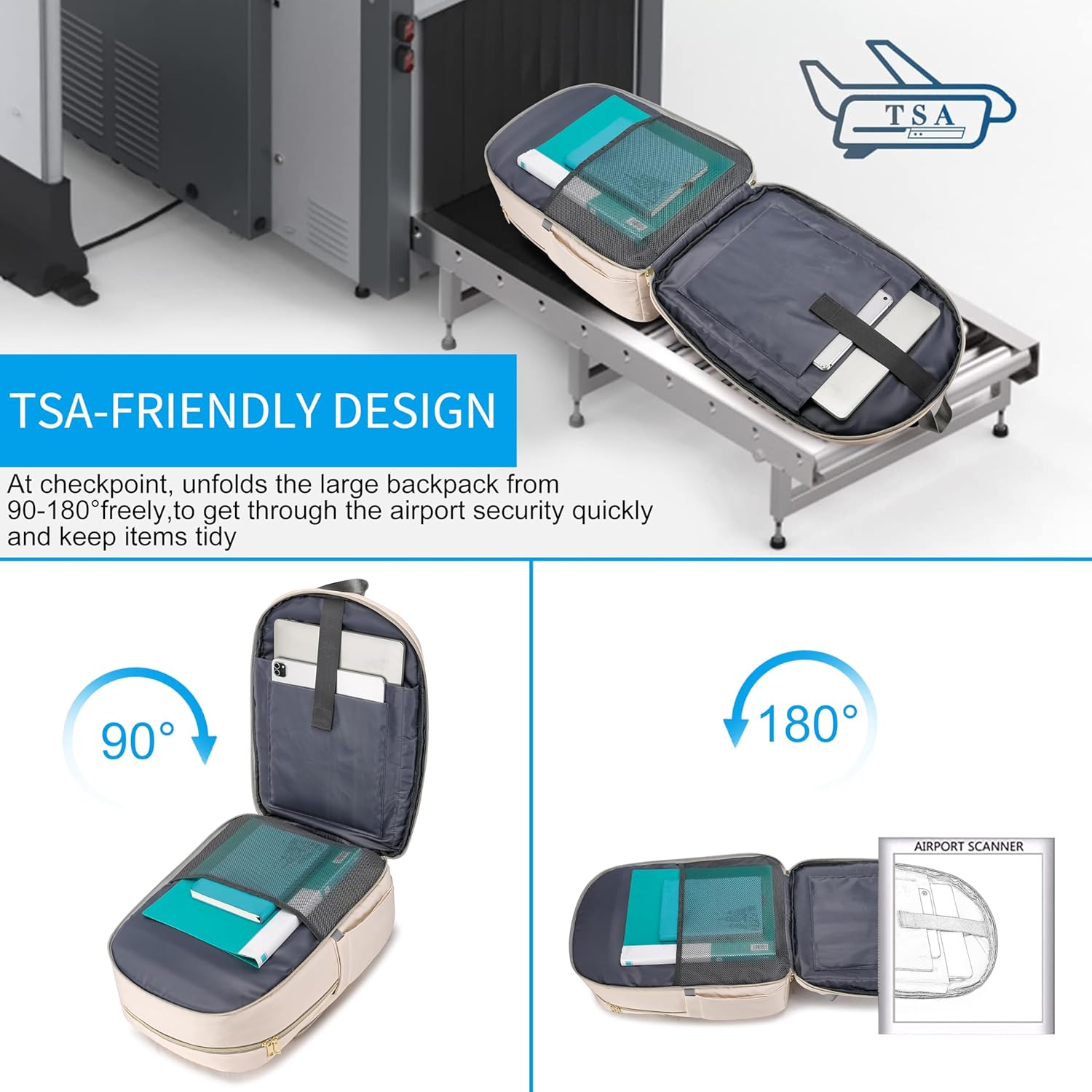 TSA-Design:TSA-Pleasant backpack could be simply scanned by safety machine.At Checkpoint,unfolds the backpack freely 90-180 diploma and the laptop computer stays flat with out taking it from the backpack, making it getting by way of safety checkpoint extra environment friendly.