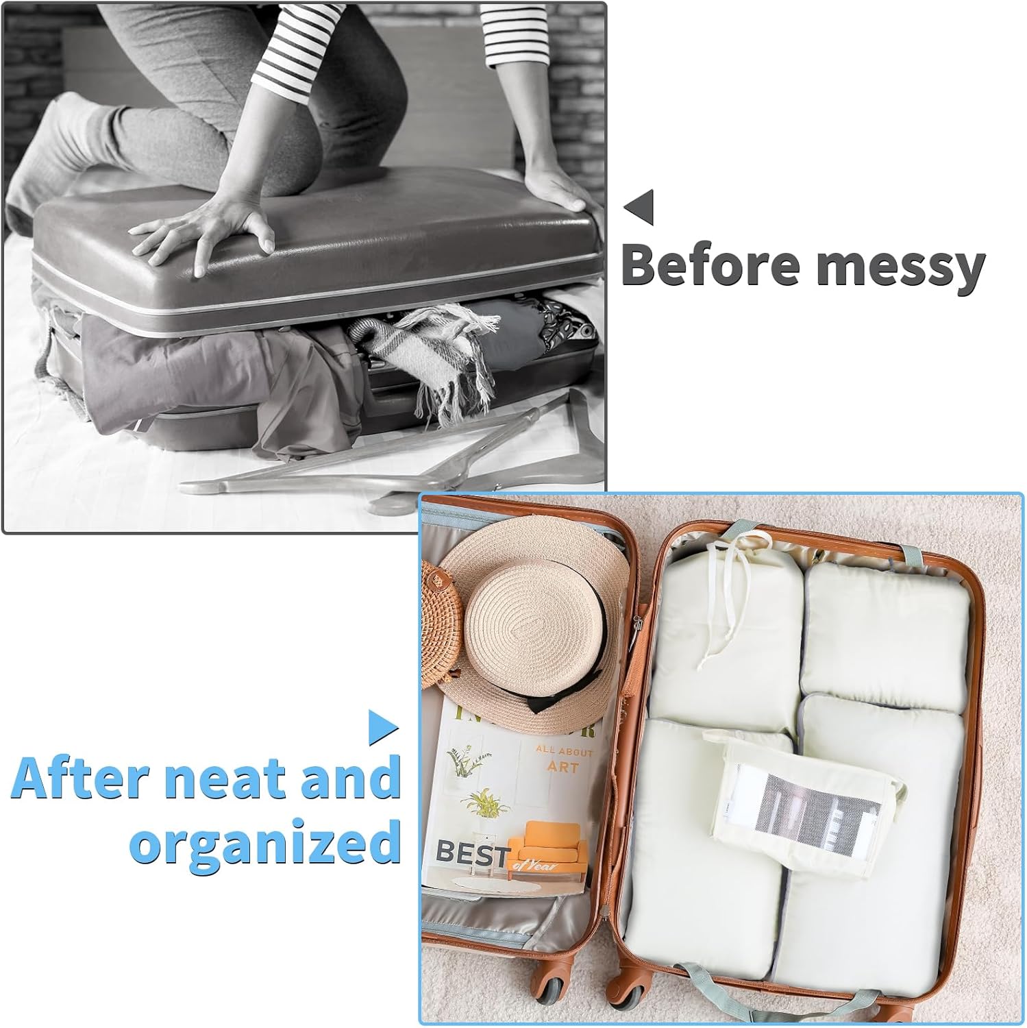 【Area Saving】The baggage organiser set undertake the outside compression zippers to compressing the packing cubes,it may save as much as 50% house.Save extra space in your stick with it baggage or journey backpack,and makes your baggage clear and neat whereas touring.