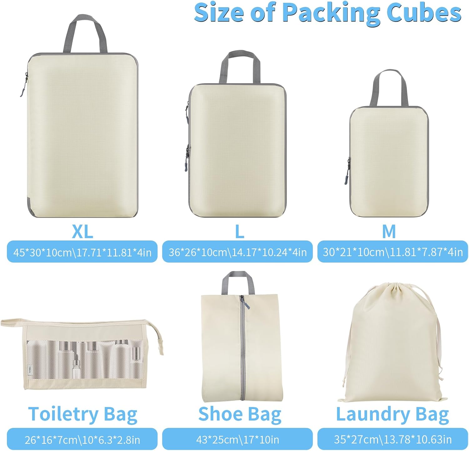【6 Pcs Packing Cubes】Our packing cubes set accommodates 3 journey cubes(XL: 45*30*10cm, L: 36*26*10cm, M: 30*21*10cm) + 1 laundry bag + 1 toiletry bag +1 shoe bag. Totally different sizes packing cubes match completely in most suitcases, simply compartmentalize your journey equipment and journey gear.