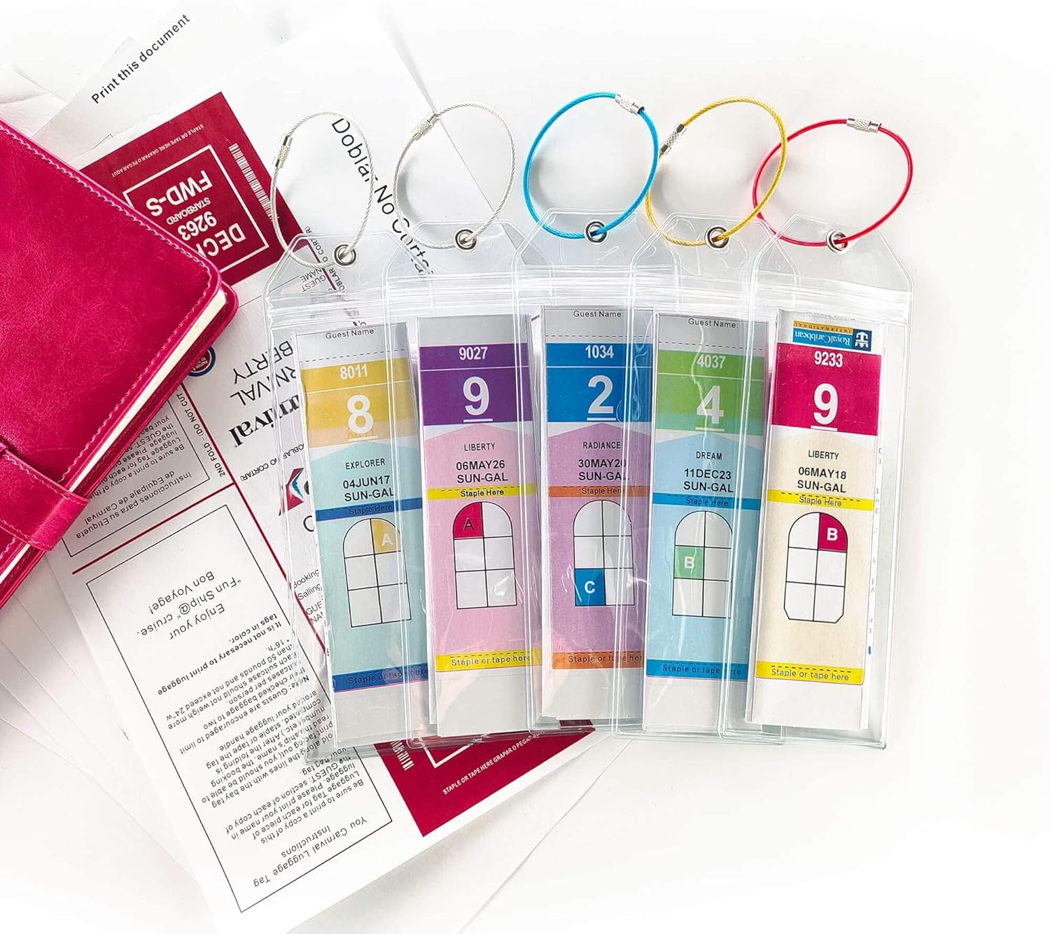 Cruise necessities embrace: 5 braided metal rings of 4 Completely different Colours and 5 Excessive – High quality clear movie star cruise baggage tag holder 2025