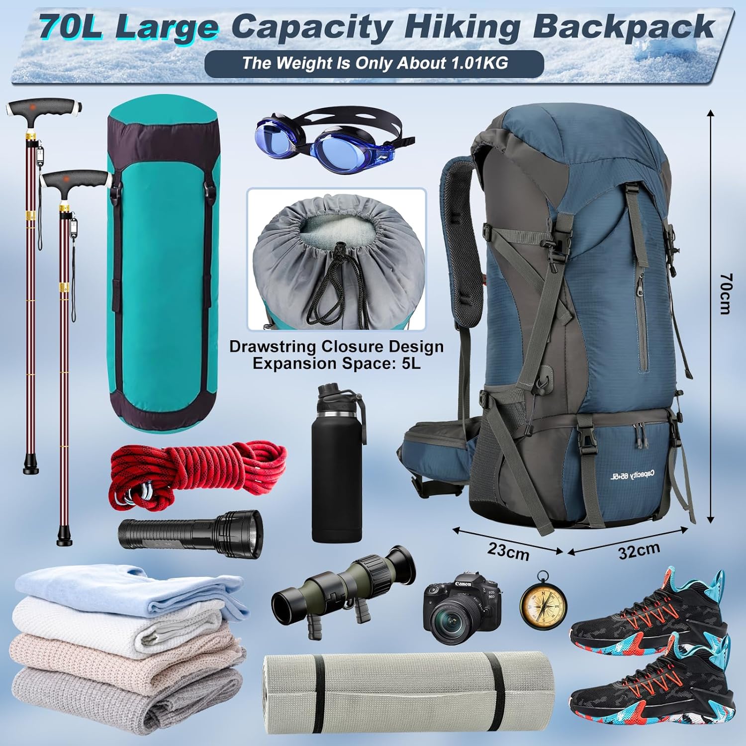 Durable 70L Hiking Camping Backpack with Waterproof Rain Cover, Lightweight Outdoor Sport Travel Daypack 65L+5L Rucksack for Climbing Touring Ultralight High-Capacity for Men and Women