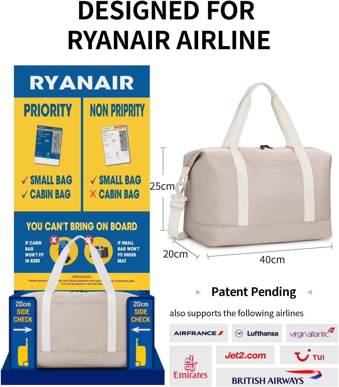 【DESIGNED FOR RYANAIR】: The ECOHUB 20L keep on luggage are personalized to adjust to Ryanair’s free baggage allowance, measuring 40x20x25 cm and weighing solely 0.78kg. Appropriate for all main airways like Jet2, British Airways, Air France, Lufthansa, Virgin Atlantic, Emirates, and TUI. NOTE: To make sure you move the RYANAIR bag tester, please do not pack it full (below 90%).