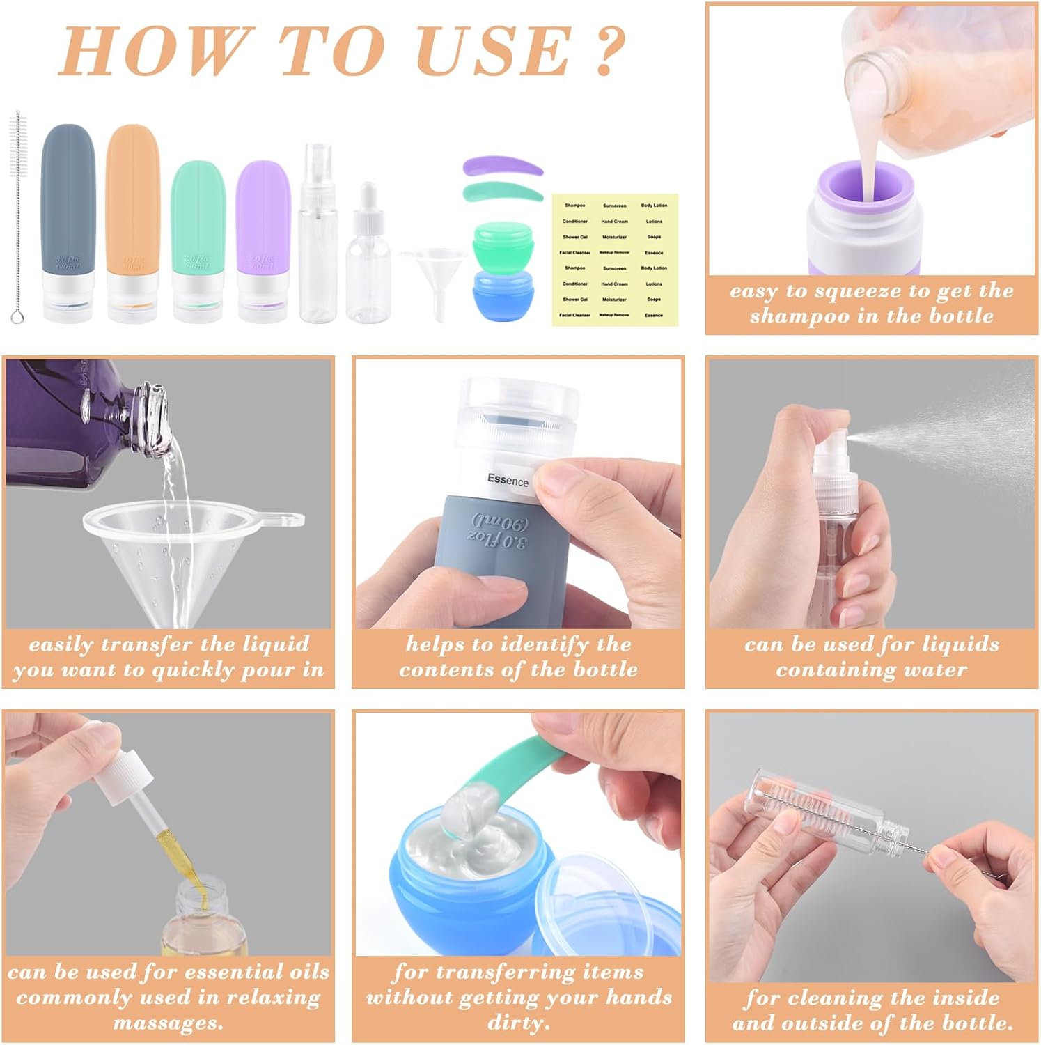 TSA APPROVED :The journey toiletry bulbs set consists of: 2x90ml/3oz + 2x60ml/2oz Squeezable Silicone Bottles+2x 20ml/0.7oz Jars, 1 Spray Bottles+1 Important Oil Bottle+2 Scoopers+1 Funnel+1 Clear Brush + 1 Web page Label + 1 Bag, complies with the Transportation Safety Administration’s (TSA) 3-1-1 Liquid Carry-On rules and comes with a TSA-compliant clear plastic pouch no bigger than one quart in dimension, and all of the containers match neatly and are appropriate for carry-on on the airplane.
