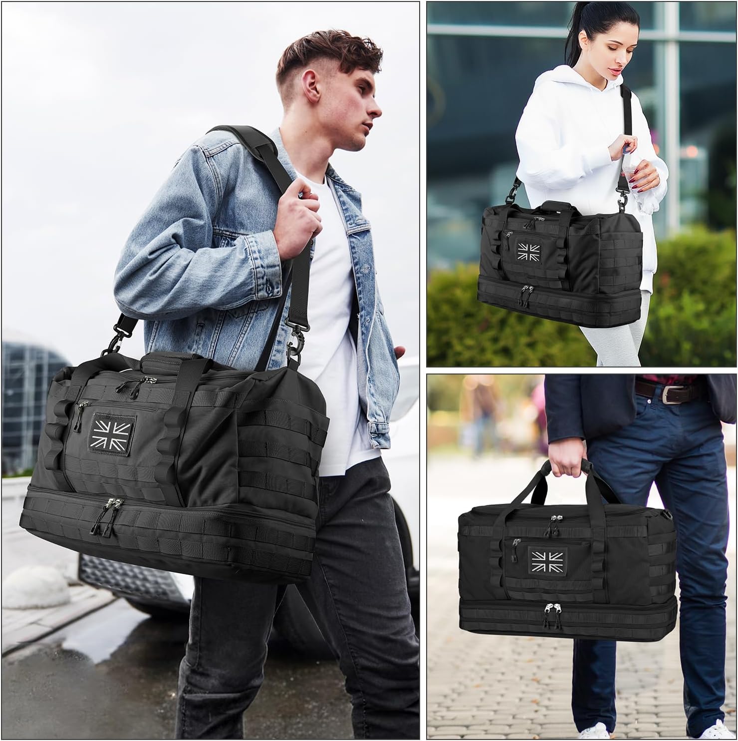 Tactical Duffle Bag’s MOLLE System: Navy duffle bag is designed with patch panels on the entrance and sides for attaching identify patches and morale patches. The MOLLE webbing of the tactical bag can be utilized to connect further gear you want. The navy look duffle bag for males meets the best calls for of outside explorers, navy fanatics and trend trendsetters for journey luggage