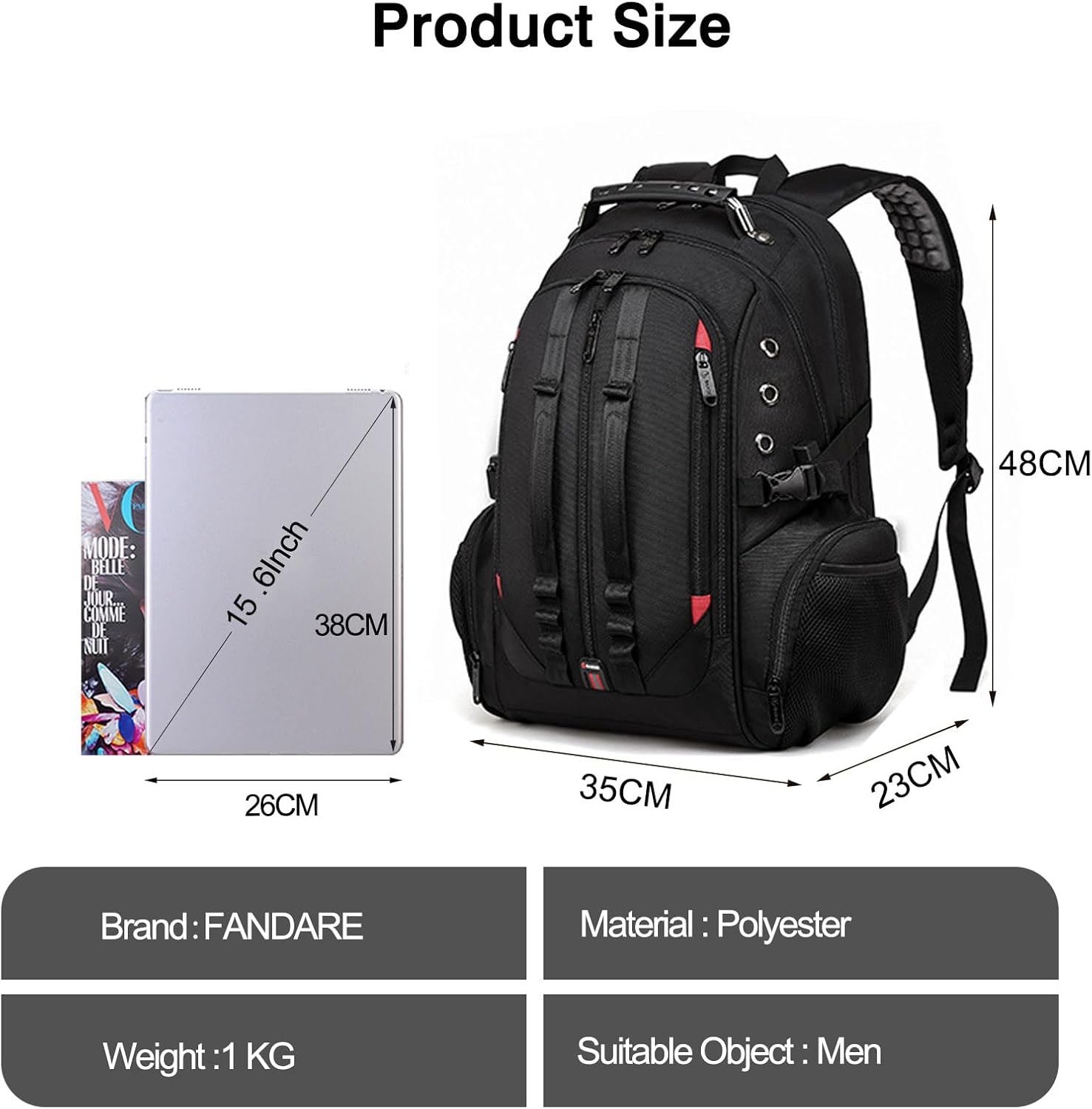 Dimensions:35x23x48cm;Weight:1kgMain Compartment: Matches UNDER 15.6 Inch Laptops and Macbook, Skinny garments, headset, books, journal, digicam, CD’s, etcFront Mixture Compartment: For Telephones, pen, keys, pockets, purse, glasses and different small gearsYou can take it onto airplane and put it within the storage bin and below seat. No have to take the suitcase.