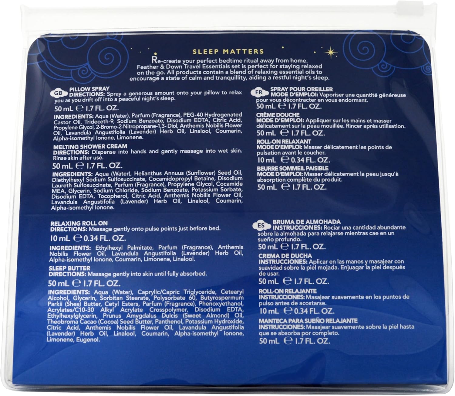 Feather & Down Travel Essentials Gift Set (Pillow Spray, Melting Shower Cream, Sleep Butter & Relaxing Roll-On) – Infused with Lavender & Chamomile Essential Oils. Vegan Friendly & Cruelty Free.