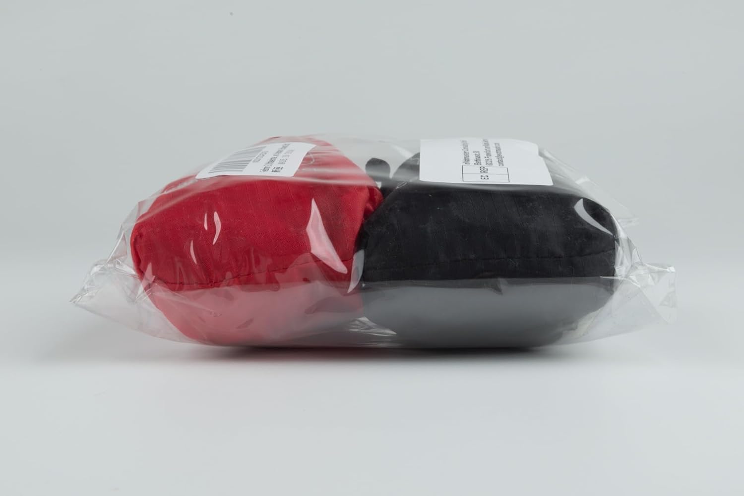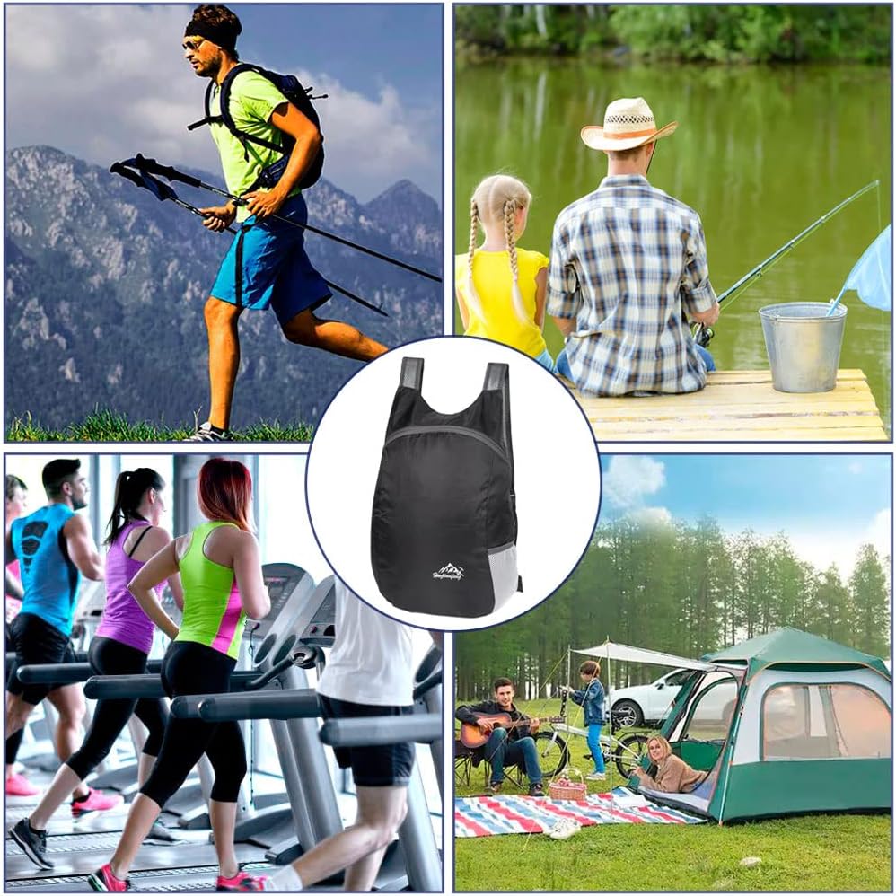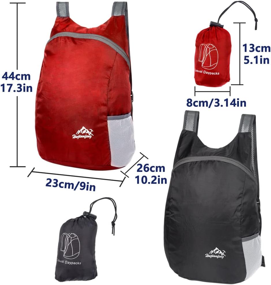 Two gentle and compact backpacks, one purple and one black. The backpack is simply the dimensions of the palm after being compressed, it is extremely appropriate for going out for sports activities, mountain climbing, touring, and brings most comfort to your journey.