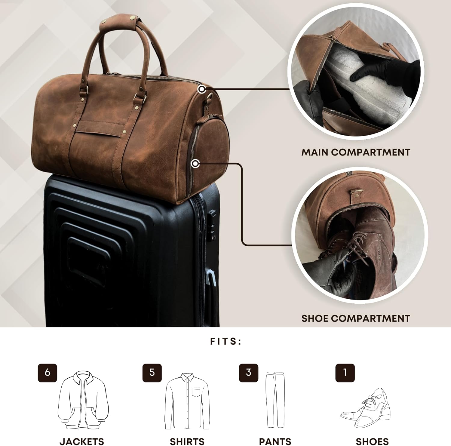 ✔️THE PERFECT TRAVEL COMPANION: Our leather-based journey bag is exemplary for touring. It has a number of compartments and pockets to maintain your belongings clear and arranged whenever you’re on the go. It has 1 MAIN POCKET, 1 SHOE COMPARTMENT, 4 SUB-COMPARTMENTS. It’s additionally completely sized so whereas it presents ample storage, it additionally meets the underseat/hand baggage bag necessities for almost all of economic airways.
