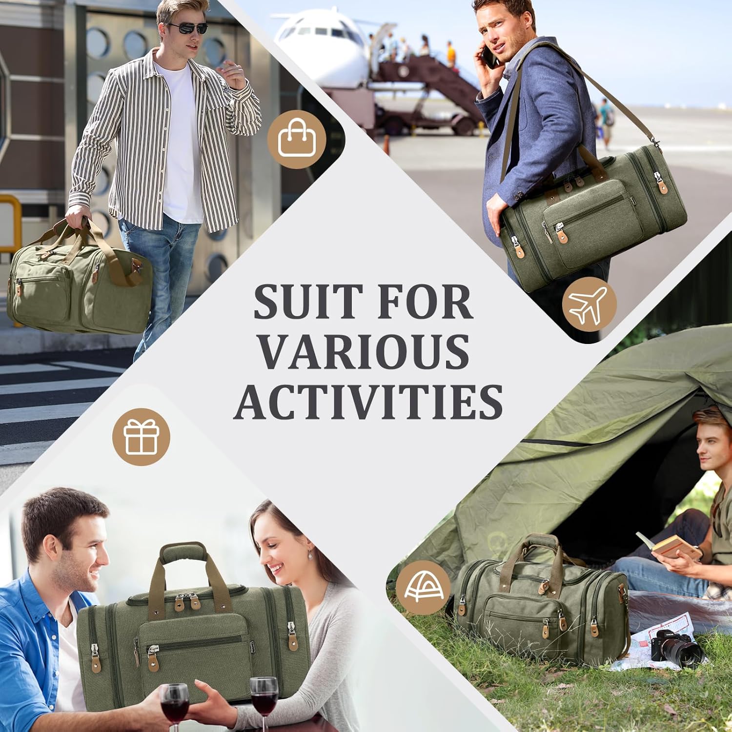 👍【Massive Expandable Canvas Duffle 】 ★★Accessible for almost 4-7 days journey ★★ Authentic Dimension (50L) : L60(66)*D28*H31cm, open the 2 aspect zippers to an prolonged dimension (60L): L66*D28*H31cm. Spacious with 50L~60L for 17″ laptop computer, A4 books and Paperwork, 8-10 fits of garments, toiletries, cosmetics, electronics and different necessities.