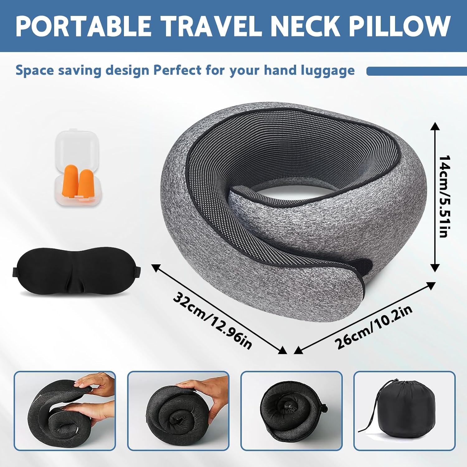 Gonggi Flyhugz Neck Pillow, Travel Pillow 360° Support, Memory Foam Travel Neck Pillow for Airplane With 3D Contoured Eye Masks,Earplugs, U-Shaped Pillow For Airplanes, Car, Office, Sleeping Upright