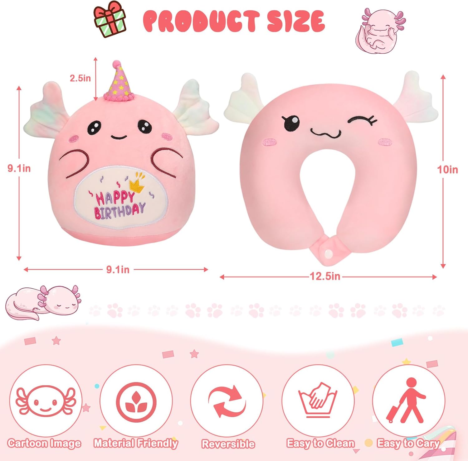 Good Birthday Reward:This childrens journey pillow printed “Completely satisfied Birthday” emblem colourful axolotl plush, and is a shock birthday plush toy to your youngsters, lovers, or pals.The axolotl journey pillow not solely offers sensible neck safety, and accompany appropriate to brighten houses, bedrooms, events, places of work, espresso retailers, and so forth.
