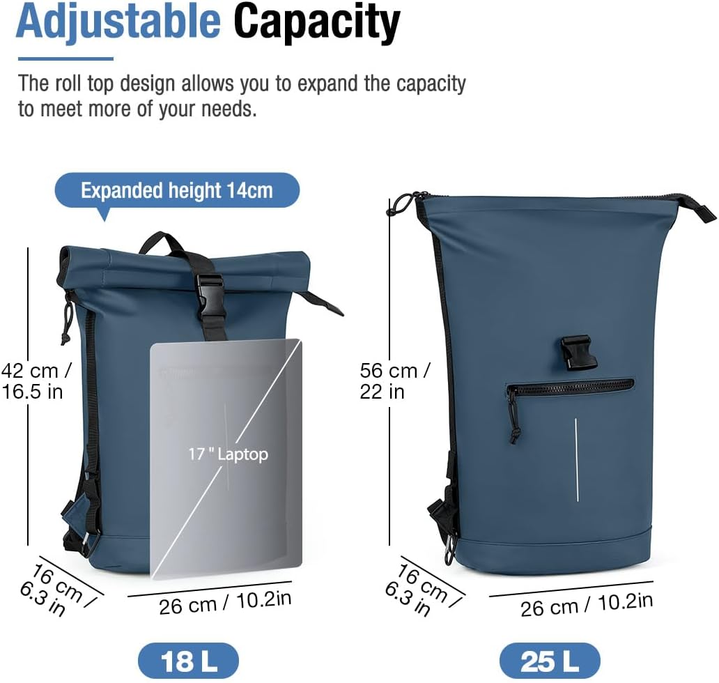 Expandable Capability: With an adjustable roll high design, this backpack can enhance its capability from 18L(26*16*42 cm) to 25L(26*16*56 cm), offering ample area for all of your work, faculty, and journey necessities.