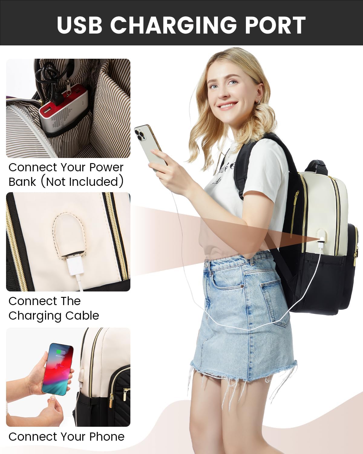 【💧Water-Resistant】The womens backpack is product of sturdy water resistant nylon material, which is simple to wash(May be wiped with moist wipes). A with smooth golden zippers and trendy stitched textures.