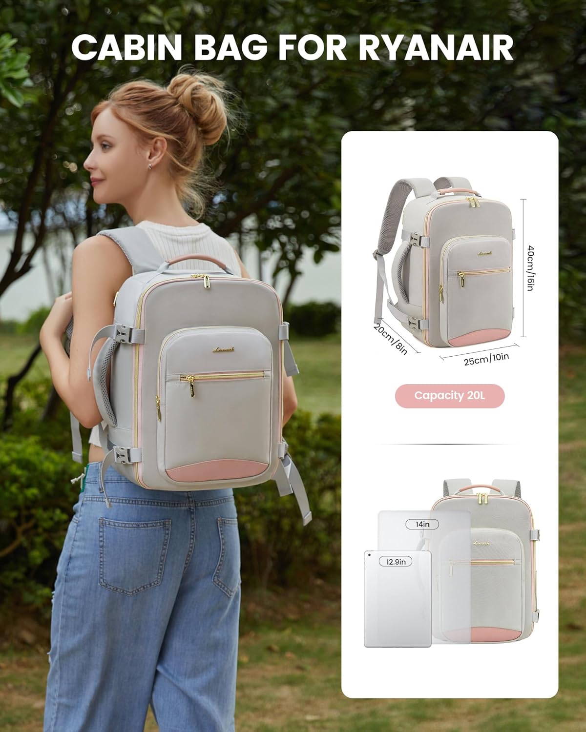 【Ryanair Authorised Measurement】The cabin bag measures 40x20x25cm, 20l, which meets the free carry-on baggage necessities of Ryan air, Wizz Air and EasyJet, permitting you to take it on board with out additional cost. Its compact design could be simply put underseat or within the overhead bin, simplifying the boarding course of.