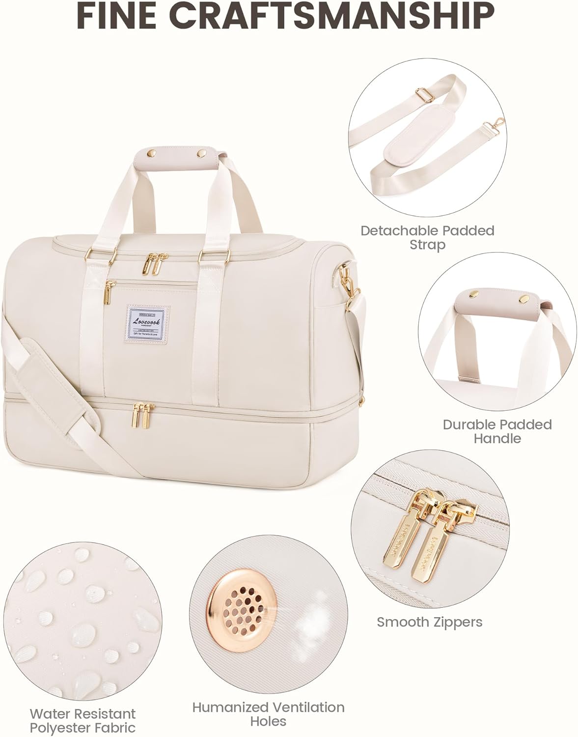 LOVEVOOK Travel Bag Gym Bag for Women, Waterproof Weekend Overnight Holdall Duffle Bags with Toiletry Bag, Shoe Compartment & Wet Pocket, Cabin Carry On Bag Hand Luggage Bag for Travel Sports, Beige