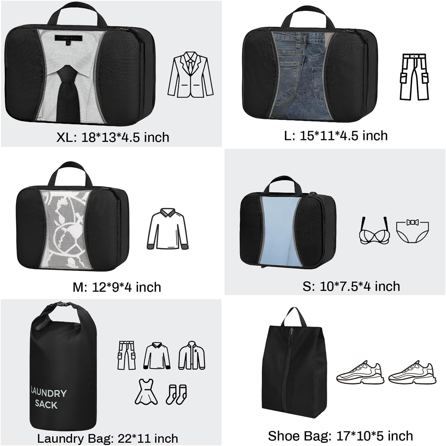 【Journey Packing Organizer】This compression packing cubes set has 4 sized packing cubes, 1 laundry bag and shoe bag. Hold your garments separate and avoids the effort of rummaging via a messy suitcase. The laundry bag can maintain lots of soiled garments, and the shoe bag can maintain a pair of alternative sneakers.