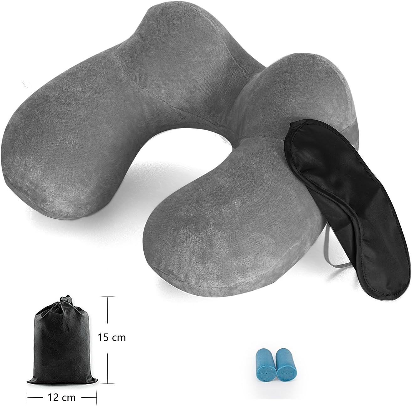 LUZWAY Inflatable Travel Pillow Neck Pillow Kits Ergonomic Soft Velvet Washable Pillowcase with Ear Plug and Eye Mask, Lightweight Sleeping Rest Cushion for Airplane, Car, and Train(Gray)