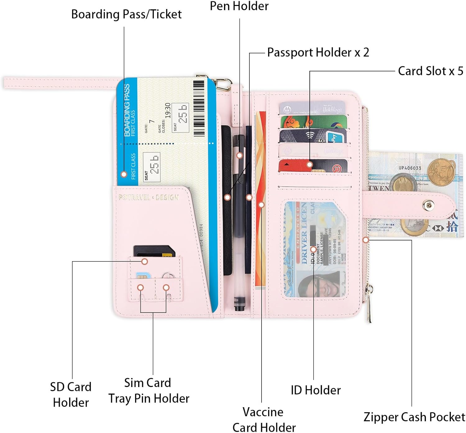 4. Nicely Organized: 2 Passport Pocket, 5 Card Slots, 1 Clear ID Window, 1 Pen Holder, 3 SIM/PIN slots and 1 lengthy zippered pocket to carry full sized paper paperwork tri-folded.