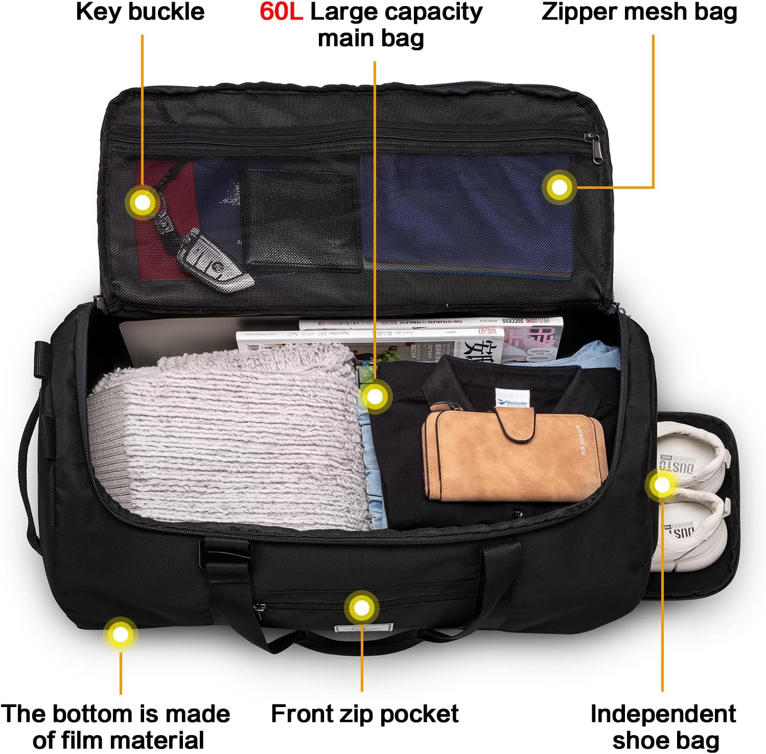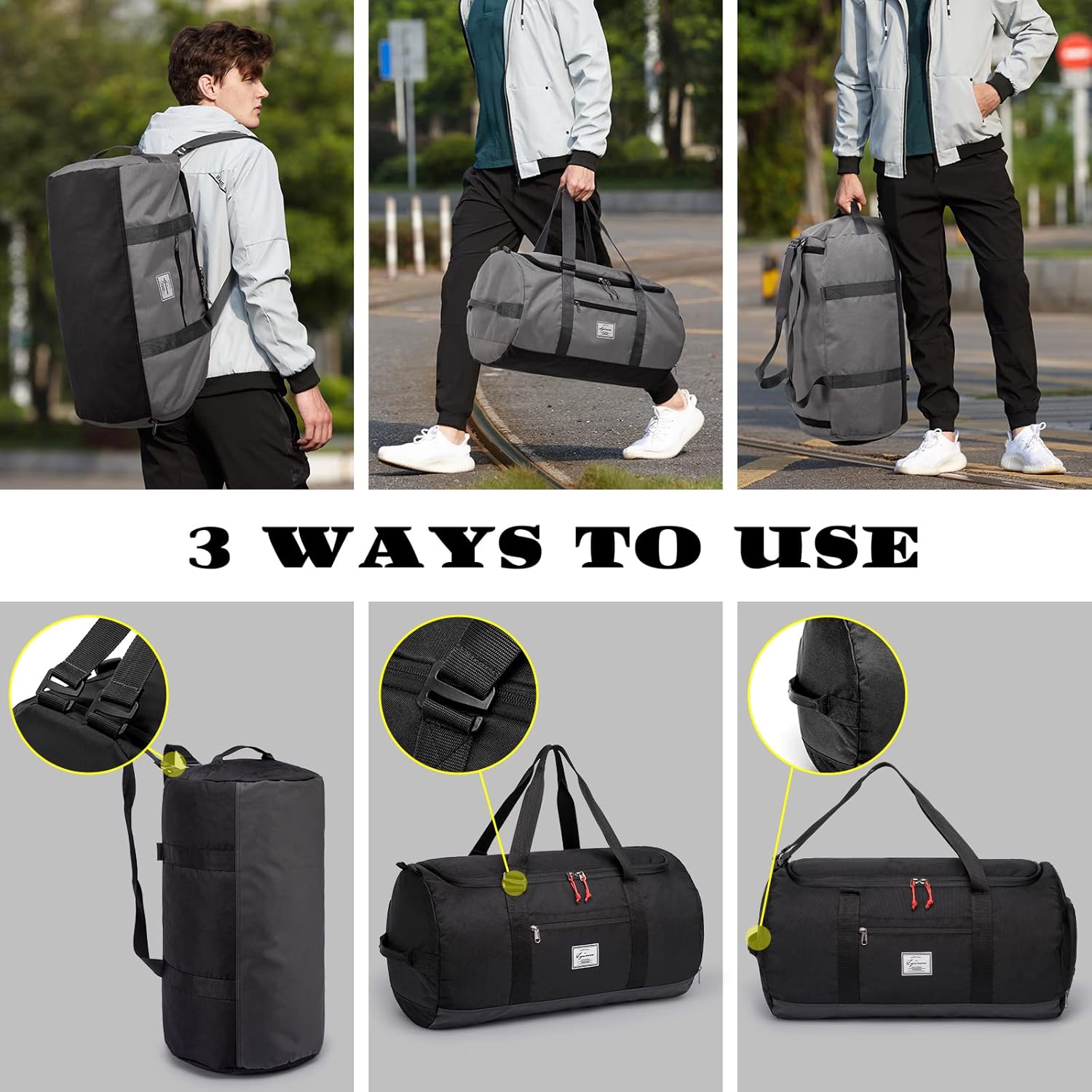 60L Massive Journey Duffle Bag: Lyweem duffel bag giant dimension can maintain a capability of 60L and weighs 1.21 kilos, and It’s gentle and sturdy. This duffle bag appropriate for brief journeys of 2-4 days or as a family storage bag. It may be folded and saved when not in use. The size are: 24″ x 12.6″ x 12.6″ inches.