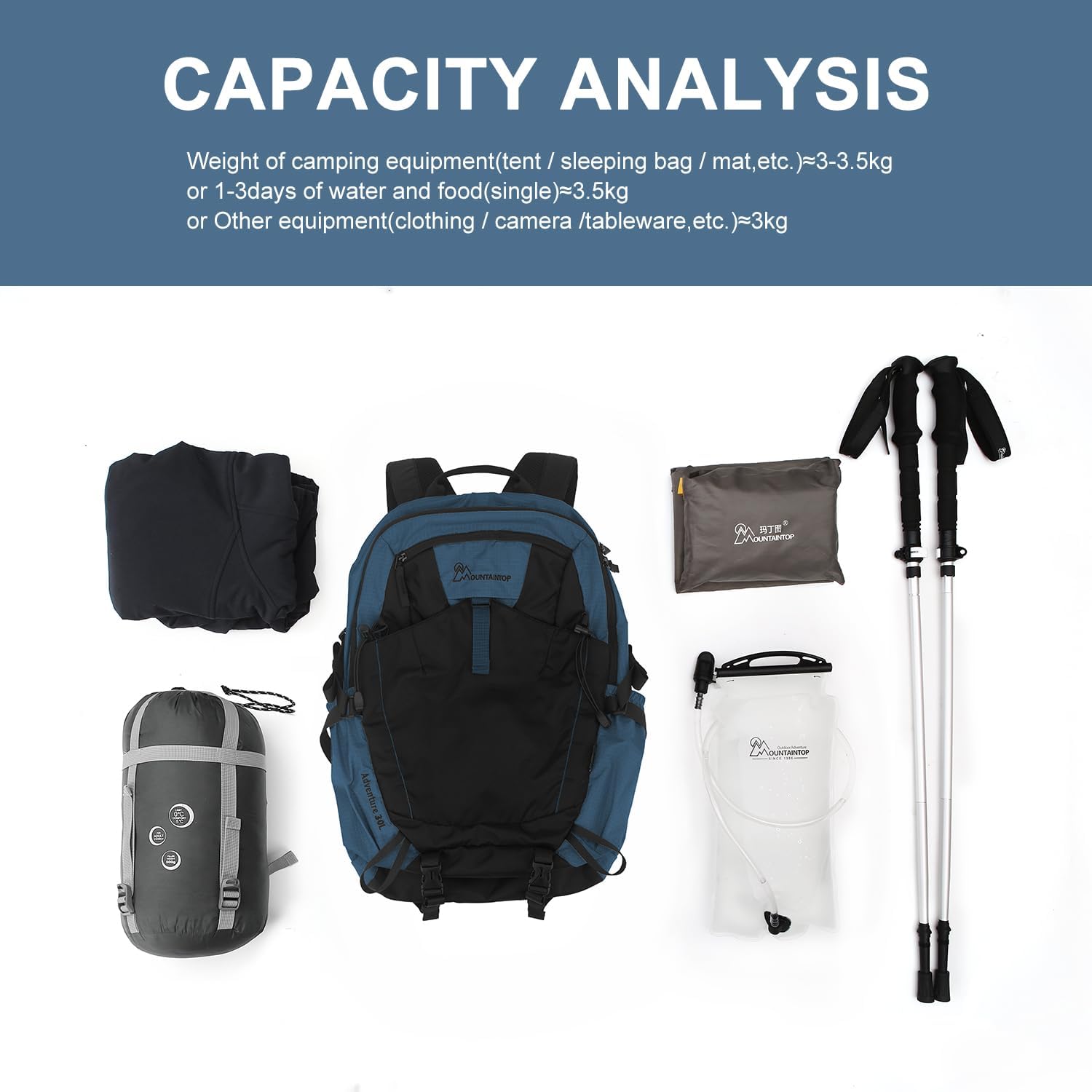 This 30L mountain climbing rucksack comes with a compartment designed for a water bladder (water bladder excluded).