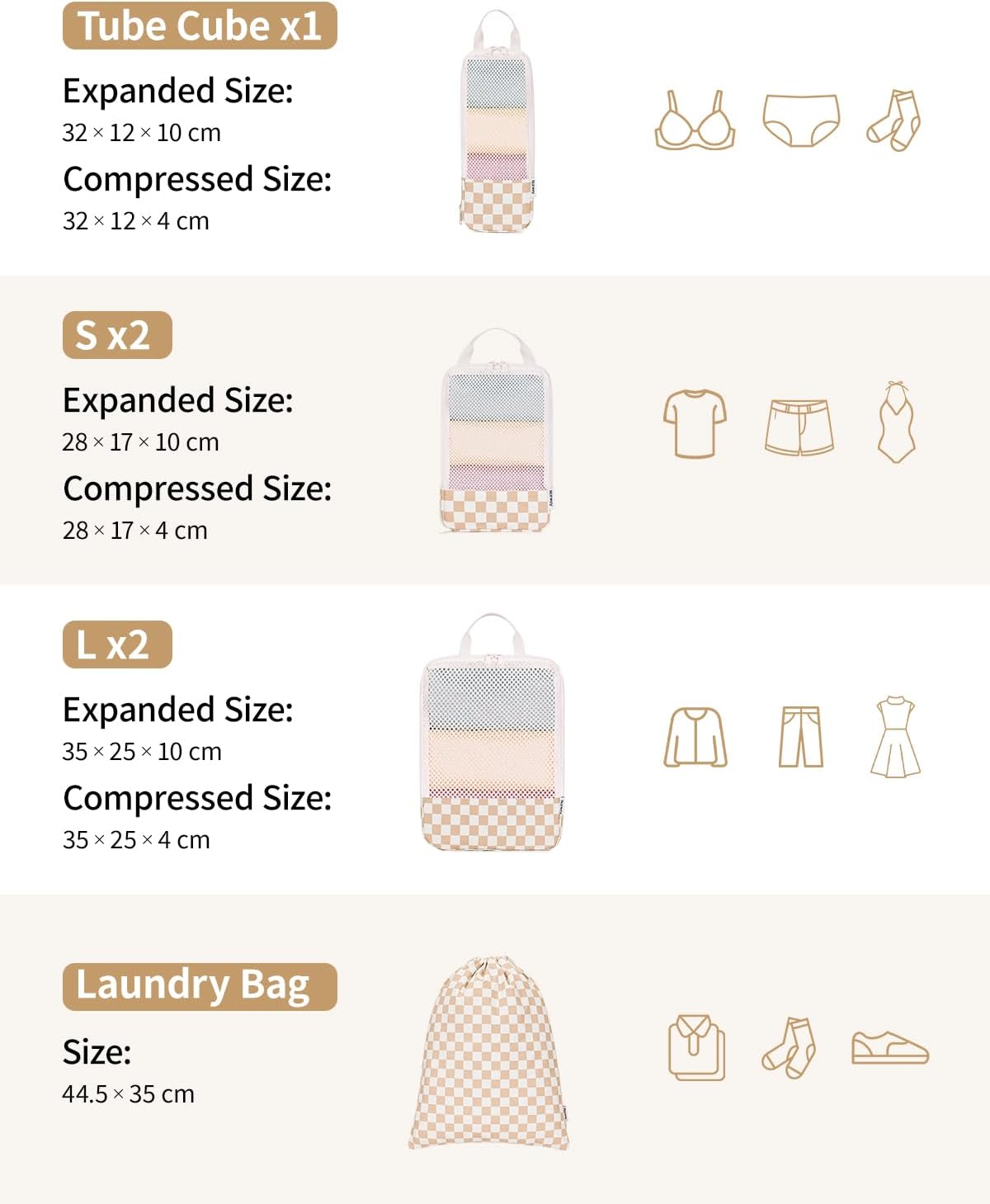 Narwey 6 Set Compression Packing Cubes for Backpack and Suitcases, Travel Organiser Packing Bags for Carry on Hand Luggage (Checkerboard Light)