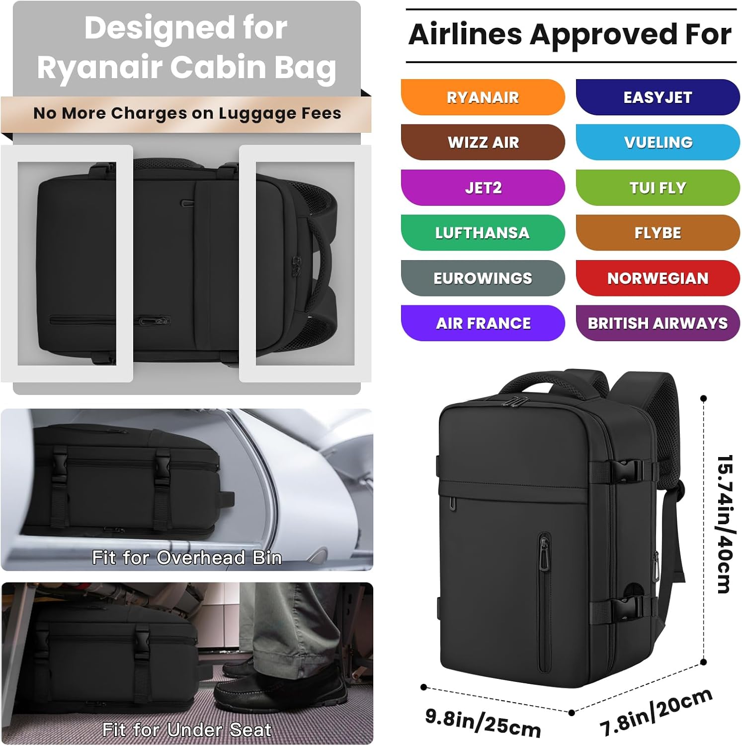 OTAHGK Cabin Bags 40×20×25 for Ryanair Underseat Carry-ons Travel Backpack Hand Luggage Bag Cabin Size 20L Flight Rucksack Casual Daypack School Office Backpack Fit 14 Inch Laptop-Black
