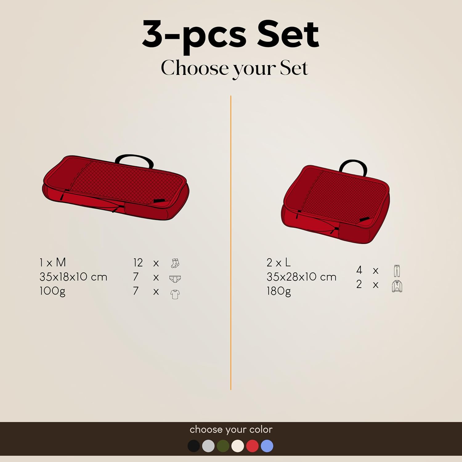 🧭 MORE ORGANISATION IN YOUR LUGGAGE – With the three packing compression cubes for journey you separate your garments, create extra space via compression and have extra group in your baggage with packing cubes for journey