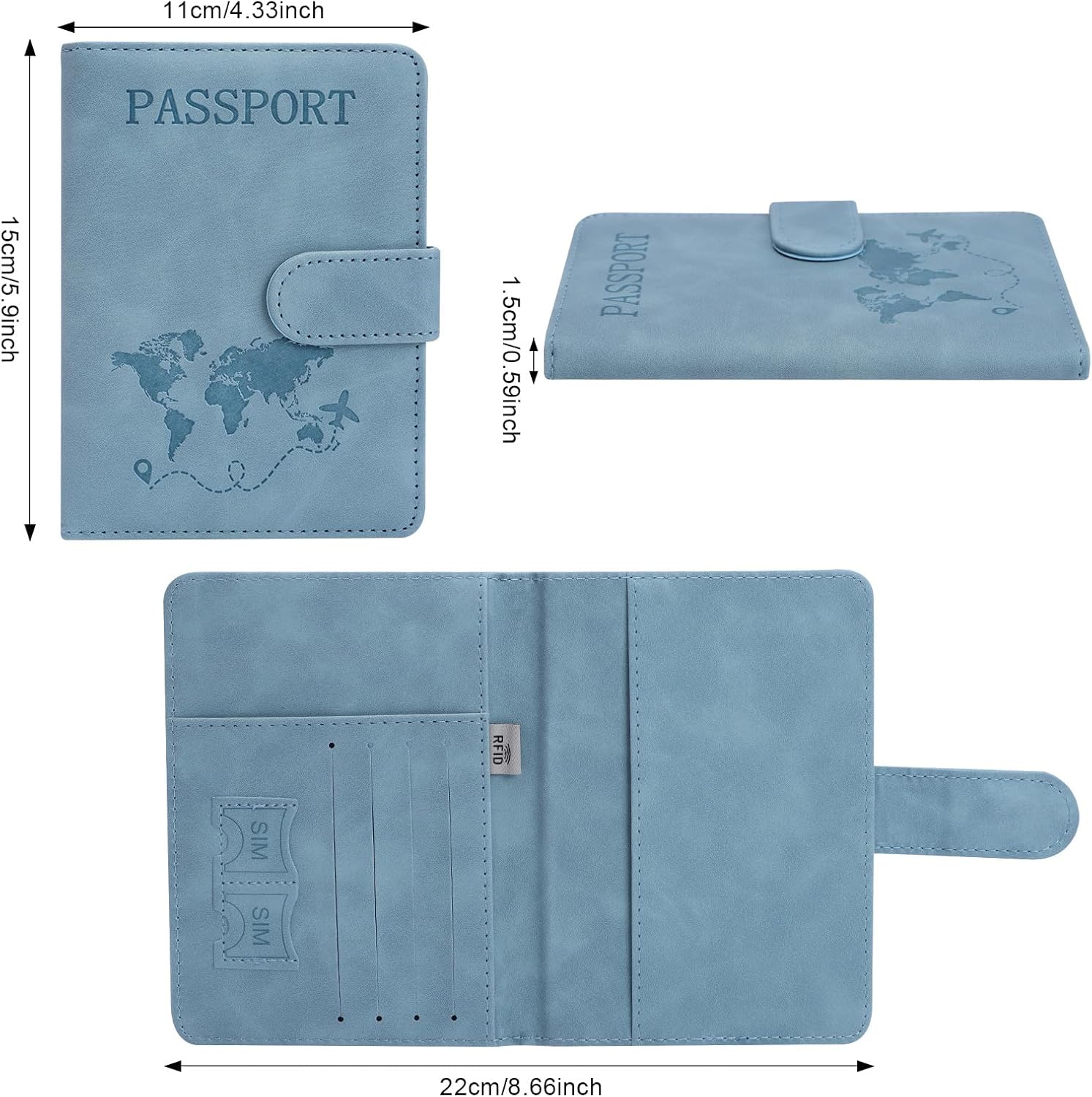 【A number of Compartments】The passport holder has a number of compartments for storing SIM playing cards, bank cards, money, flight tickets and passport. The passport holder measures 15*11*1.5 cm (22 cm when open). The compact measurement ensures neat storage